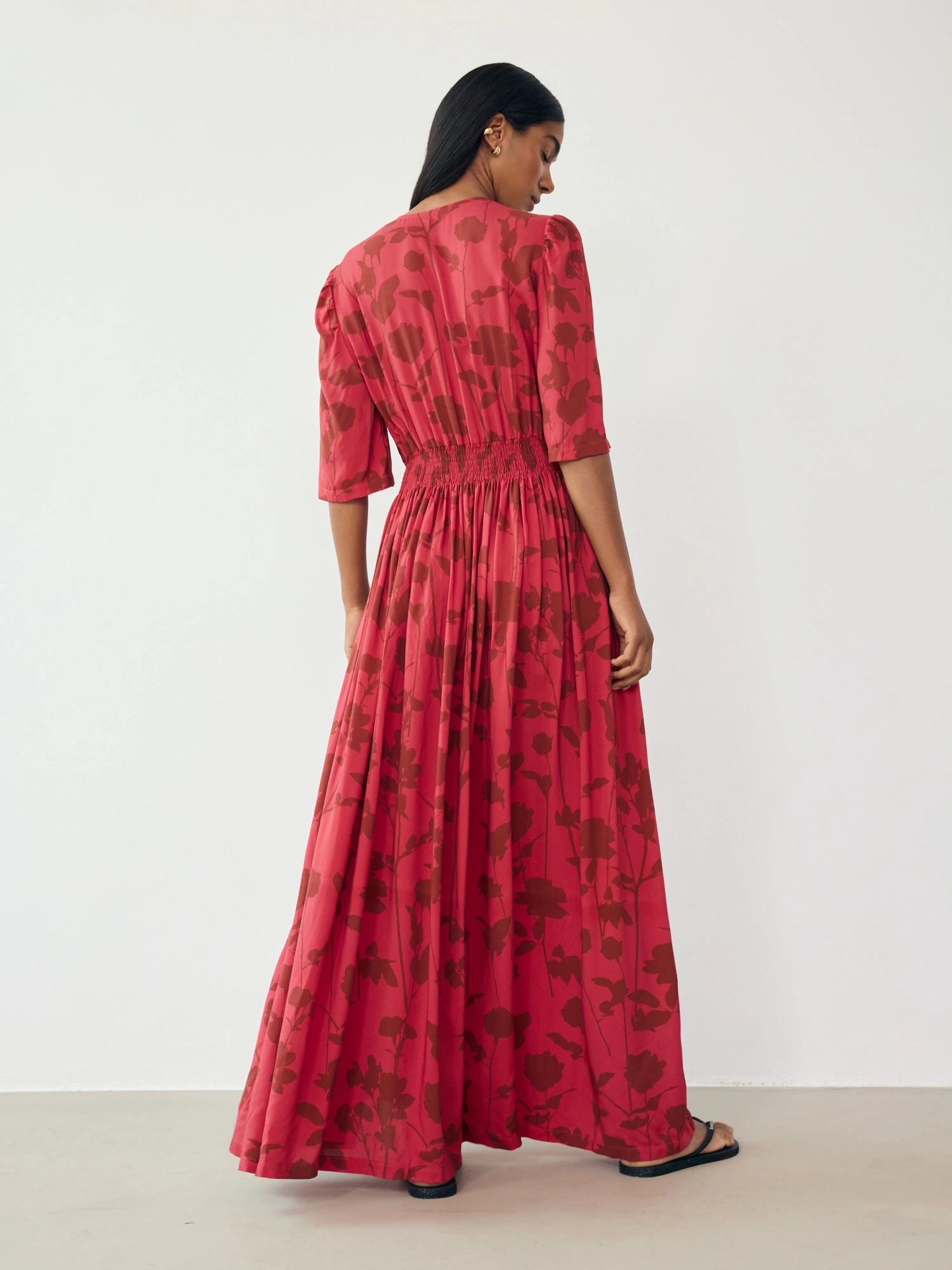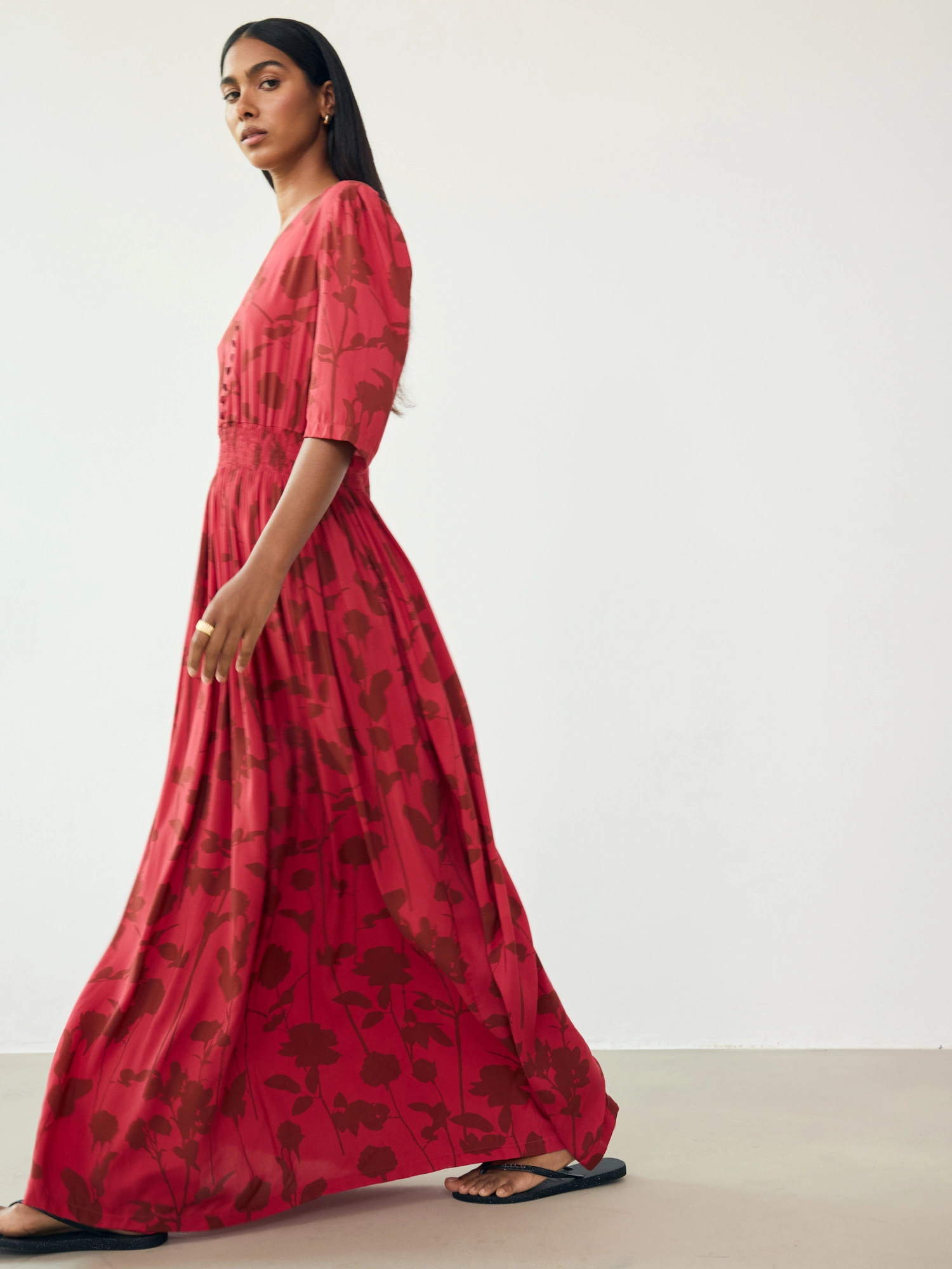 Codzienna sukienka maxi wykonana w 100% z lekkiej, oddychającej wiskozy. Ma głęboki dekolt w kształcie litery V, lekko bufiaste rękawy o długości za łokieć i marszczony pas, który pięknie podkreśla talię i nadaje sylwetce proporcji. Dół sukienki jest rozkloszowany i swobodnie opływa ciało, tworząc efekt lekkości przy każdym ruchu.