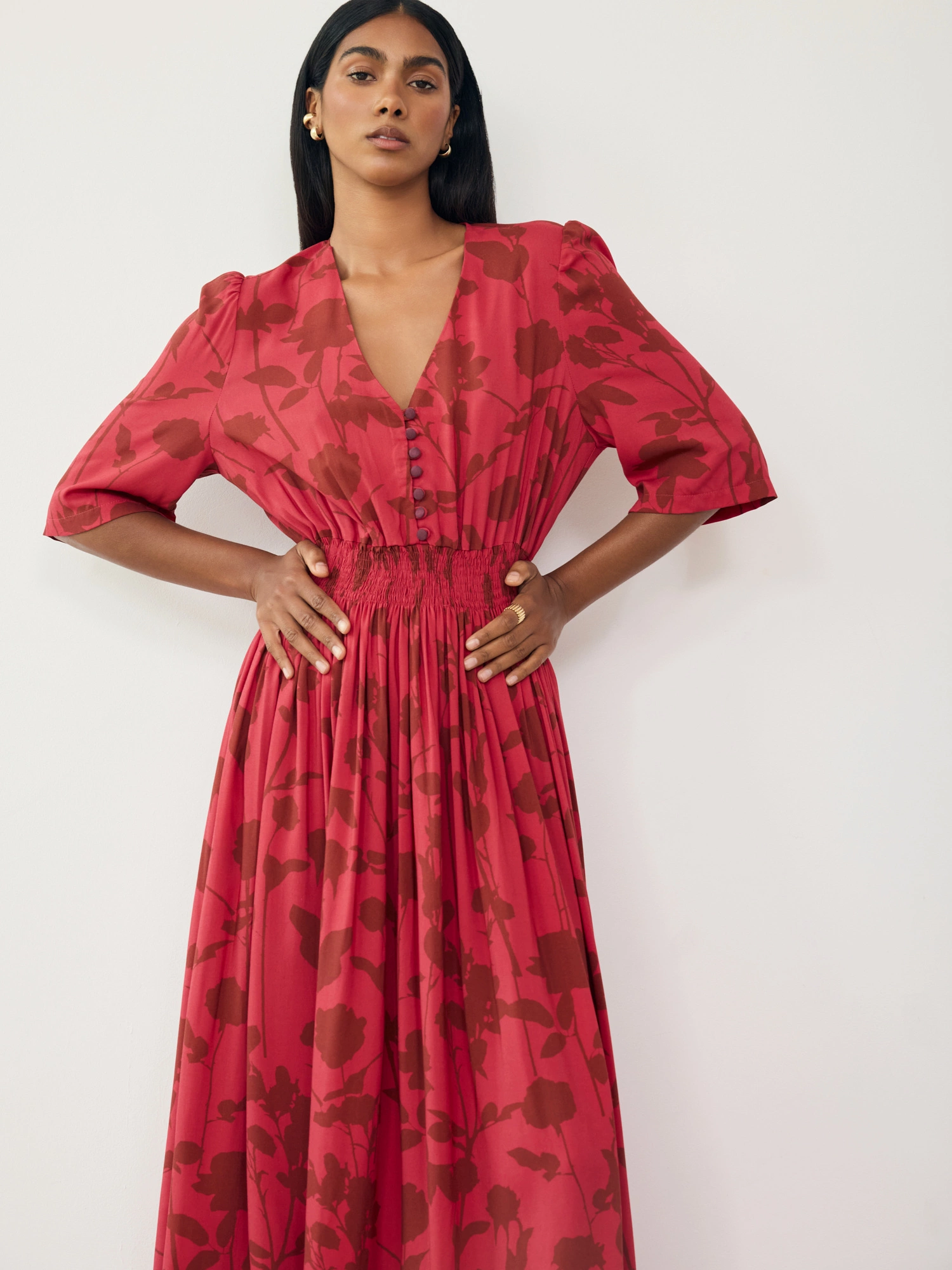 Wyrazisty, kwiatowy nadruk w odcieniach czerwieni i bordo sprawia, że sukienka przyciąga spojrzenia i idealnie sprawdzi się zarówno na co dzień, jak i na letnie przyjęcia czy wakacyjne wyjazdy.