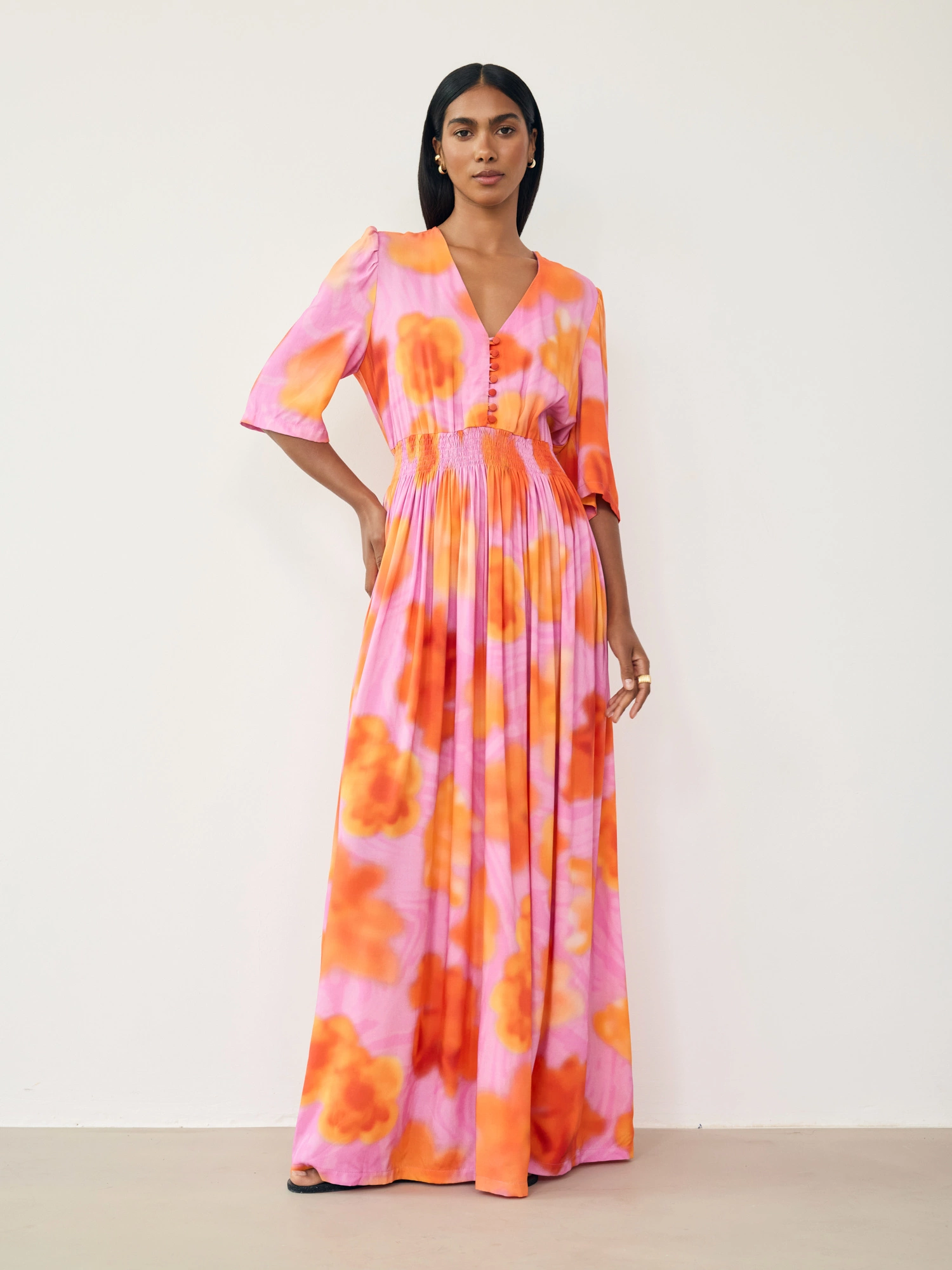 Codzienna sukienka maxi wykonana w 100% z lekkiej, oddychającej wiskozy. Ma głęboki dekolt w kształcie litery V, lekko bufiaste rękawy o długości za łokieć i marszczony pas, który pięknie podkreśla talię i nadaje sylwetce proporcji. Dół sukienki jest rozkloszowany i swobodnie opływa ciało, tworząc efekt lekkości przy każdym ruchu.
