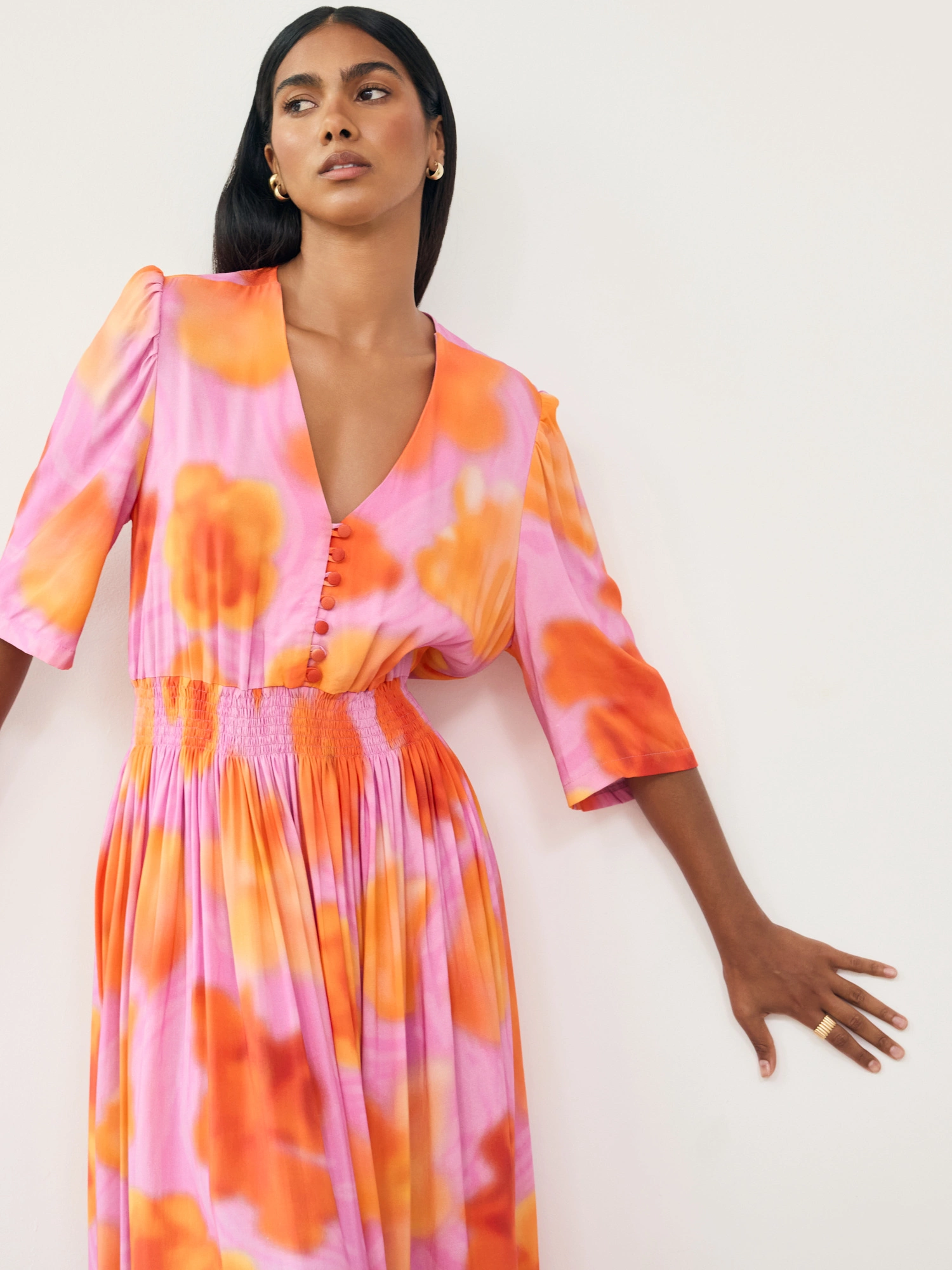 Wyrazisty, kwiatowy nadruk w neonowych odcieniach sprawia, że sukienka przyciąga spojrzenia i idealnie sprawdzi się zarówno na co dzień, jak i na letnie przyjęcia czy wakacyjne wyjazdy.