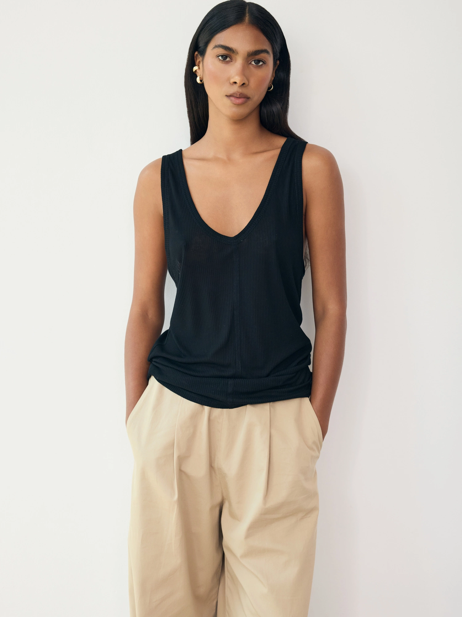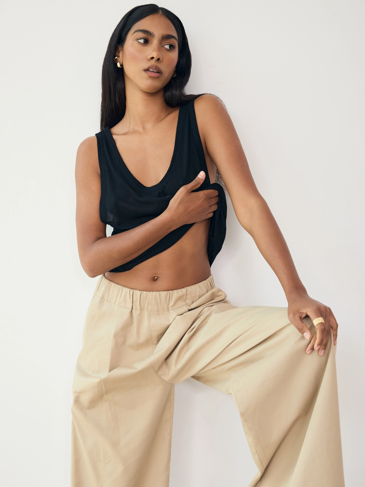 Transparentny top uszyty z miękkiej, przewiewnej i prążkowanej wiskozy. Delikatny materiał subtelnie otula sylwetkę, zapewniając wyjątkowy komfort i zmysłowy wygląd. Utrzymany w fasonie oversize - ma głęboki, zaokrąglony dekolt i wycięcia pod pachami, jest dłuższy z charakterystycznym szwem na środku. To minimalistyczna propozycja, idealna w duecie z ozdobną bielizną lub nonszalancko narzucona na bikini. Prosty i surowy w formie, a zarazem unikatowy w każdej stylizacji.