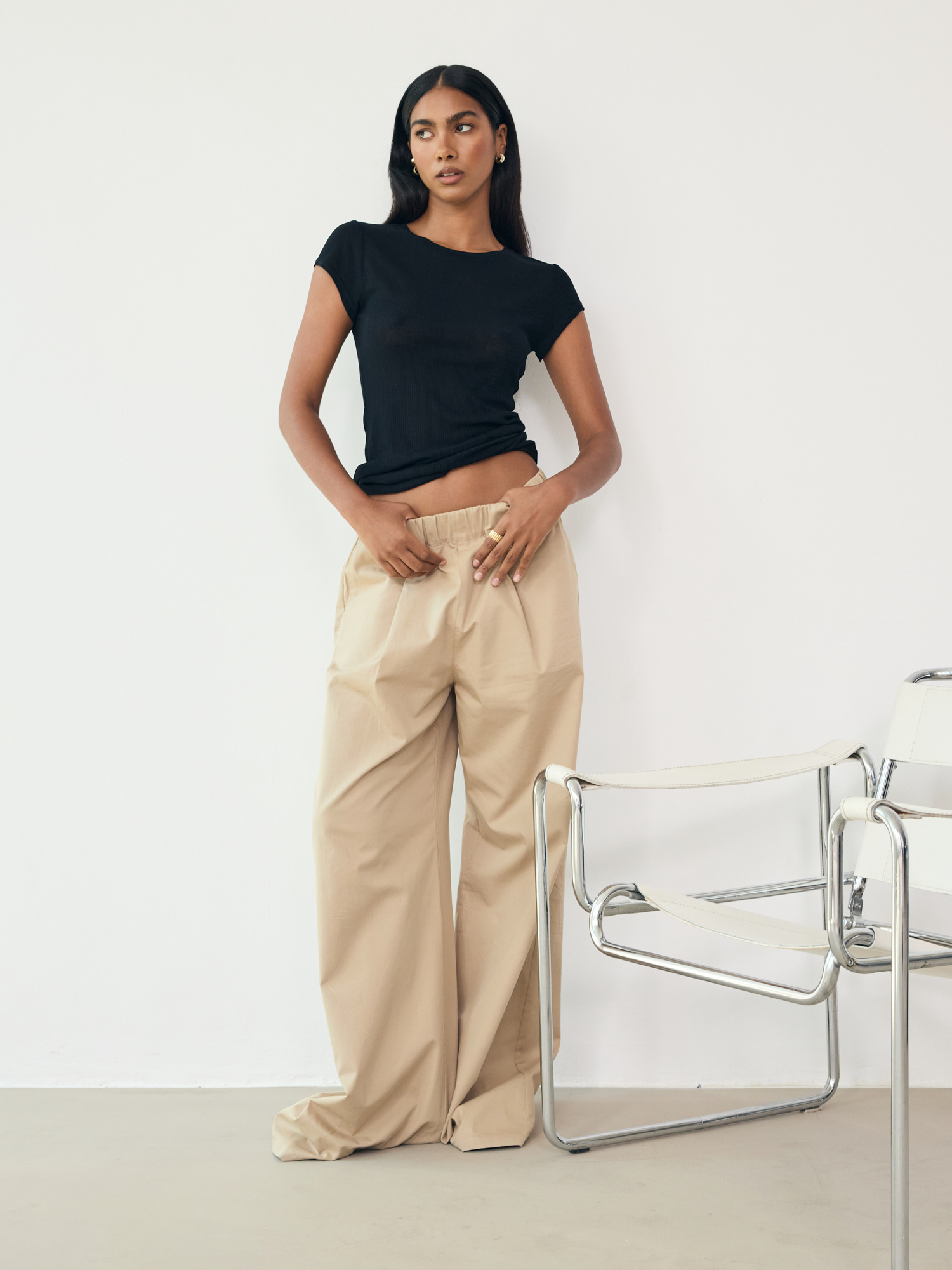 Klasyczny T-shirt uszyty z miękkiej, przewiewnej i prążkowanej wiskozy. Delikatny, transparentny materiał subtelnie otula sylwetkę, zapewniając wyjątkowy komfort i zmysłowy wygląd. To minimalistyczna propozycja, idealna w duecie z ozdobną bielizną lub nonszalancko narzucona na bikini. Prosty i surowy w formie, a zarazem unikatowy w każdej stylizacji.