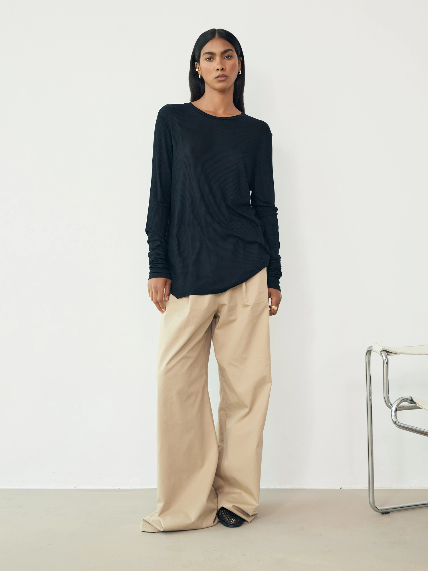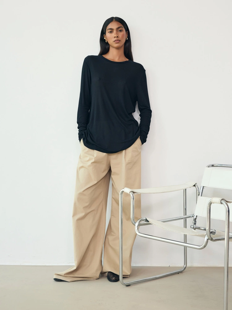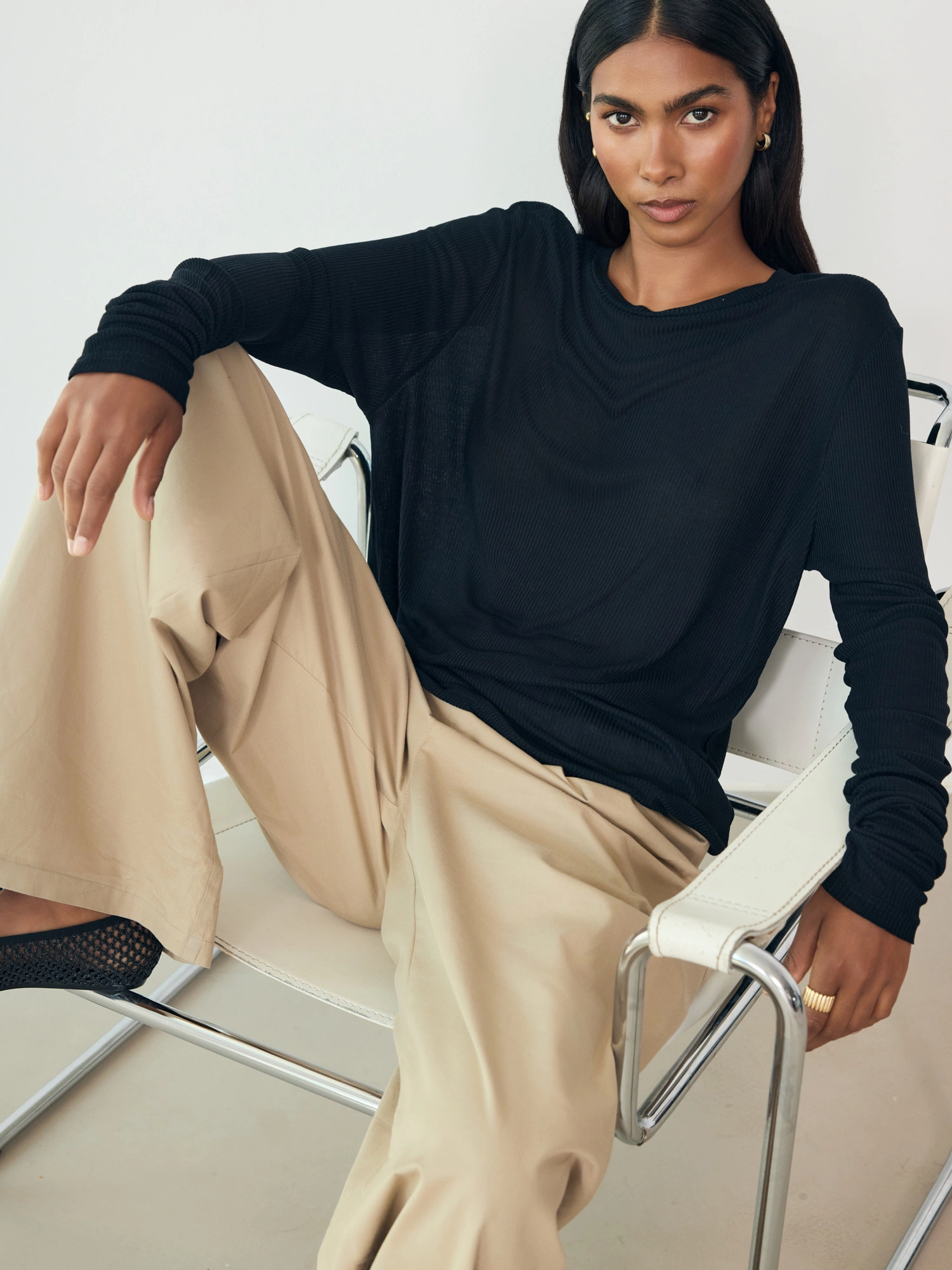 Transparentny longsleeve uszyty z miękkiej, przewiewnej i prążkowanej wiskozy. Delikatny materiał subtelnie otula sylwetkę, zapewniając wyjątkowy komfort i zmysłowy wygląd. Utrzymany w fasonie oversize - jest wysoko zabudowany pod szyją, dłuższy i z charakterystycznie wydłużonymi rękawami. To minimalistyczna propozycja, idealna w duecie z ozdobną bielizną lub nonszalancko narzucona na bikini. Prosty i surowy w formie, a zarazem unikatowy w każdej stylizacji.