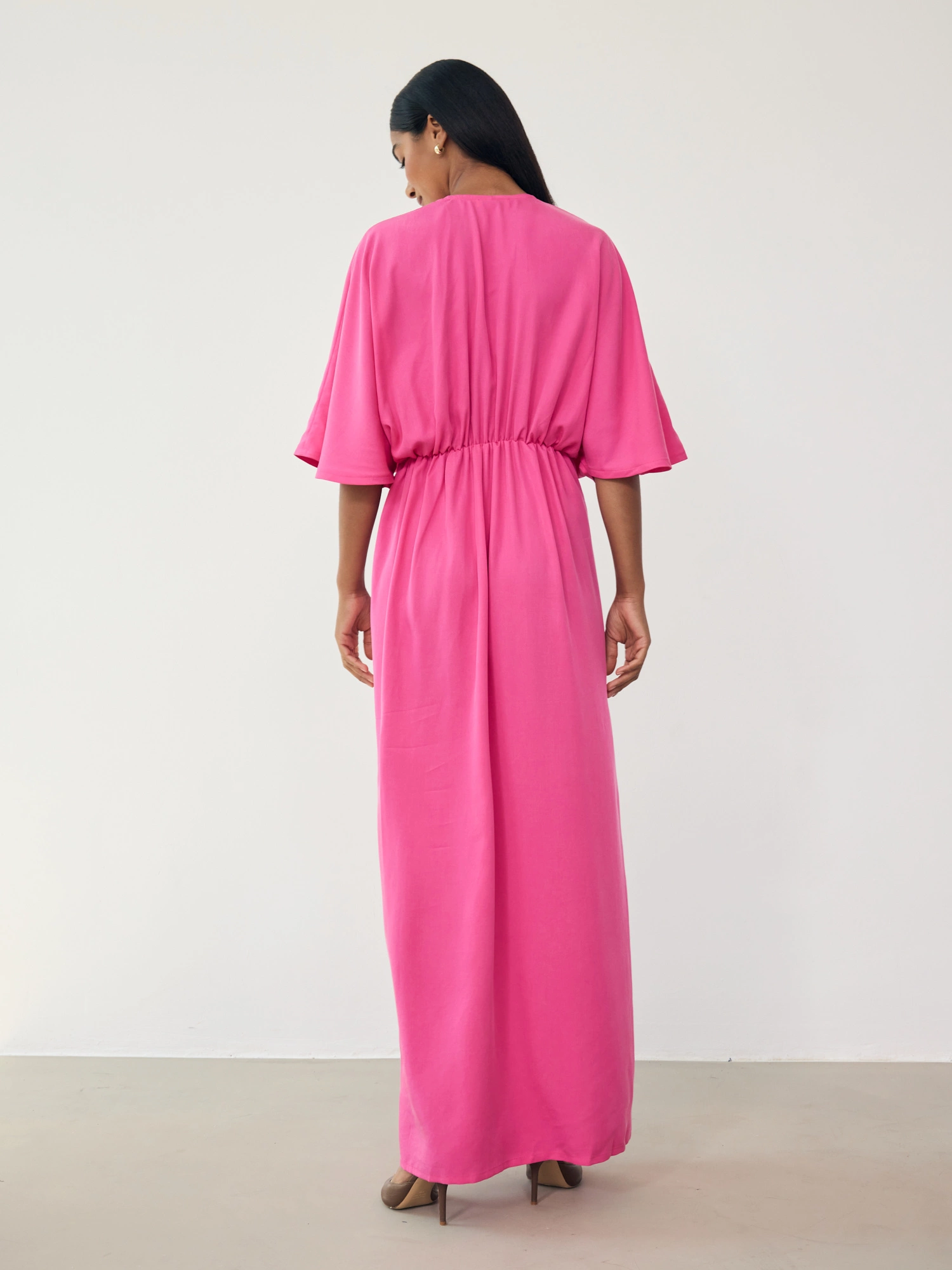Sukienka maxi wykonana z miękkiego i lejącego tencelu. Utrzymana w zwiewnym fasonie w stylu kimono - ma luźne, lekko opadające rękawy, wysmuklający szyję dekolt w serek, talię podkreśloną gumką z efektownym supłem i długi dół na zakładkę, który zmysłowo eksponuje nogi. To fason, który pasuje na każdą sylwetkę, a z odpowiednimi dodatkami perfekcyjnie zda egzamin podczas eleganckiego wyjścia, jak i w bardziej codziennym wydaniu. Jest uniwersalna, multi-zadaniowa i niezwykle kobieca.