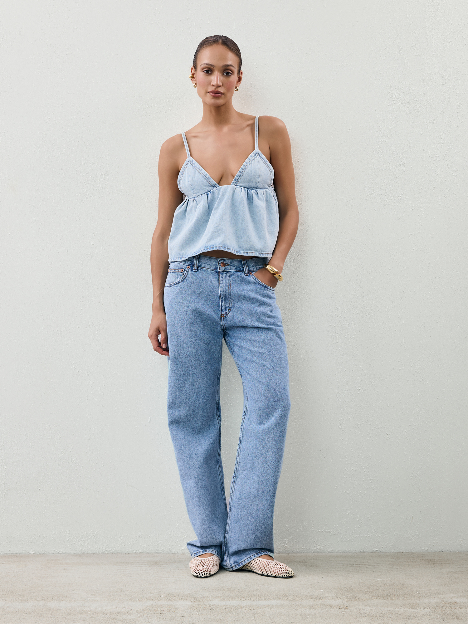Top wykonany z miękkiego denimu o romantycznie kobiecym kroju. Ma głęboki dekolt w kształcie litery V, cienkie, związywane na tyle ramiączka i lekki rozkloszowany dół z subtelnie podkreśloną linią biustu. To top, który nie potrzebuje wiele, by zrobić całą stylizację - łącz z ulubionymi jeansami, denimowymi szortami, spódnicą maxi lub szerokimi spodniami, by uzyskać zarówno codzienny, jak i bardziej elegancki look.