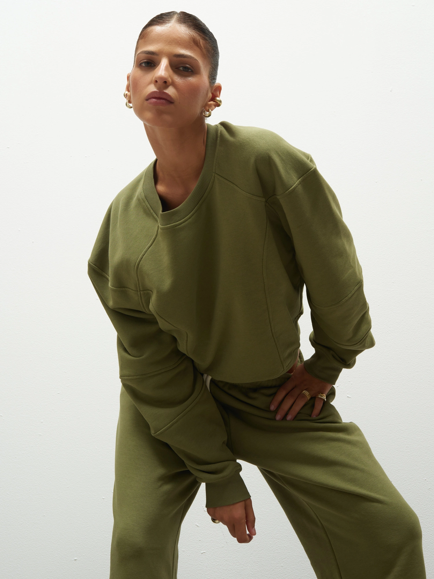 Bluza wykonana z miękkiej, przyjemnej w dotyku bawełny, wewnątrz wykończona pętelką. Ma klasyczny krój z obniżoną linią ramion i charakterystycznymi przeszyciami, które dodają jej wyrazistości i unikatowego stylu. W zestawie ze spodniami MILO tworzy sportowy set w nieco bardziej eleganckim wydaniu - nowoczesny i minimalistyczny - idealny zarówno do codziennych stylizacji, jak i na weekendowy relaks.