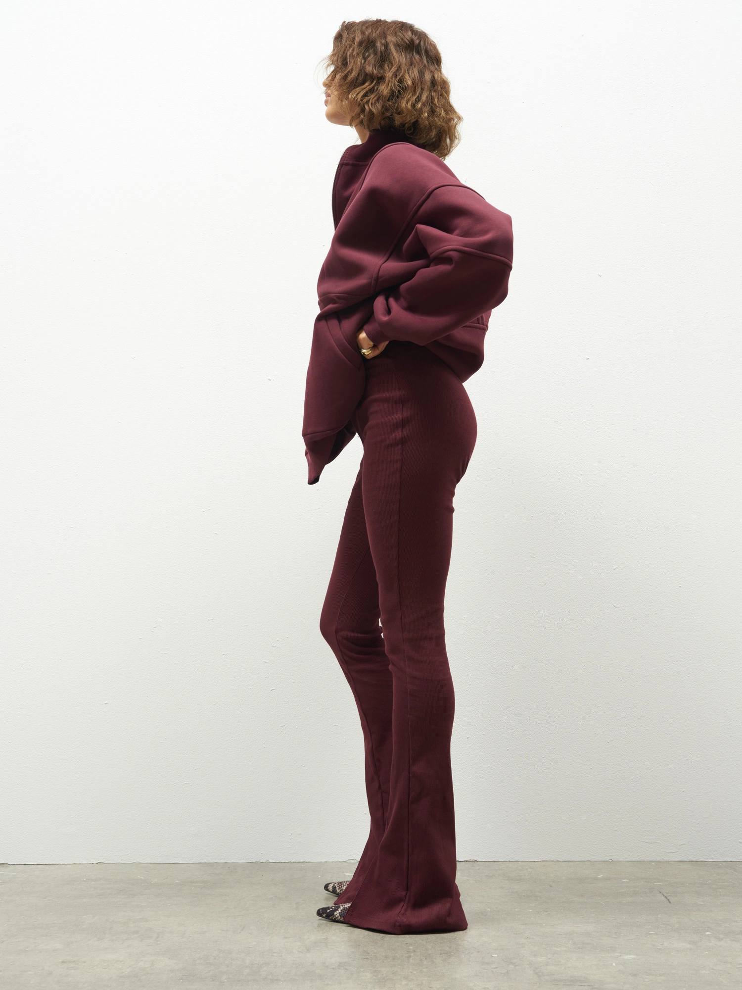 Legginsy z rozszerzanymi nogawkami typu flared i charakterystycznym pęknięciem z przodu. Mają wysoki stan z ozdobnymi przeszyciami, a dzięki prążkowanej strukturze są niezwykle wygodne i idealnie dopasowują się do sylwetki. To propozycja, która sprawdzi się zarówno w sportowej wersji – w połączeniu z bluzą CHILL, jak i w bardziej eleganckim wydaniu – z topem, marynarką i obcasami. Komfortowe, ponadczasowe i uniwersalne.