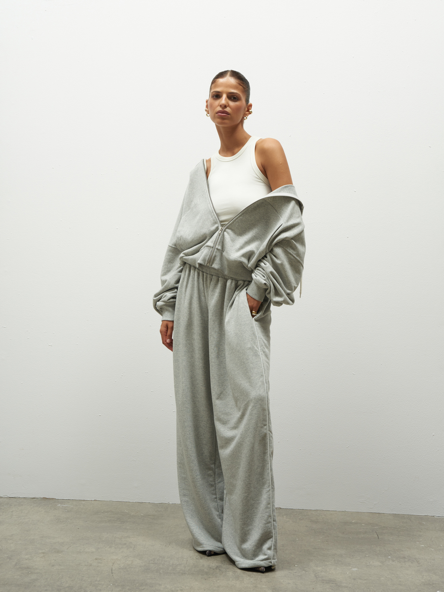 Szerokie spodnie dresowe wykonane z ultra miękkiej bawełny, wewnątrz wykończone pętelką. W pasie wygodna guma z dodatkowym wiązaniem, dzięki czemu możesz nosić je tak jak lubisz najbardziej - wyżej lub nisko na biodrach. Szerokie, wygodne nogawki, na dole z wąską gumką do ściągnięcia i ozdobnym lampasem po bokach. Łącząc z pudełkową bluzą na zamek lub z krótkim topem PADDED i skórzaną kurtką, stworzysz zestaw idealny na rozpoczęcie nowego sezonu.