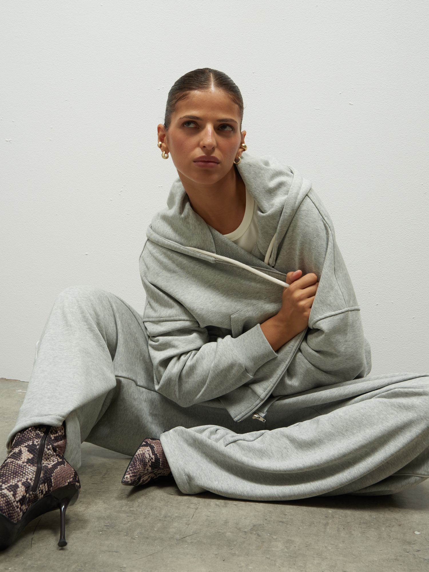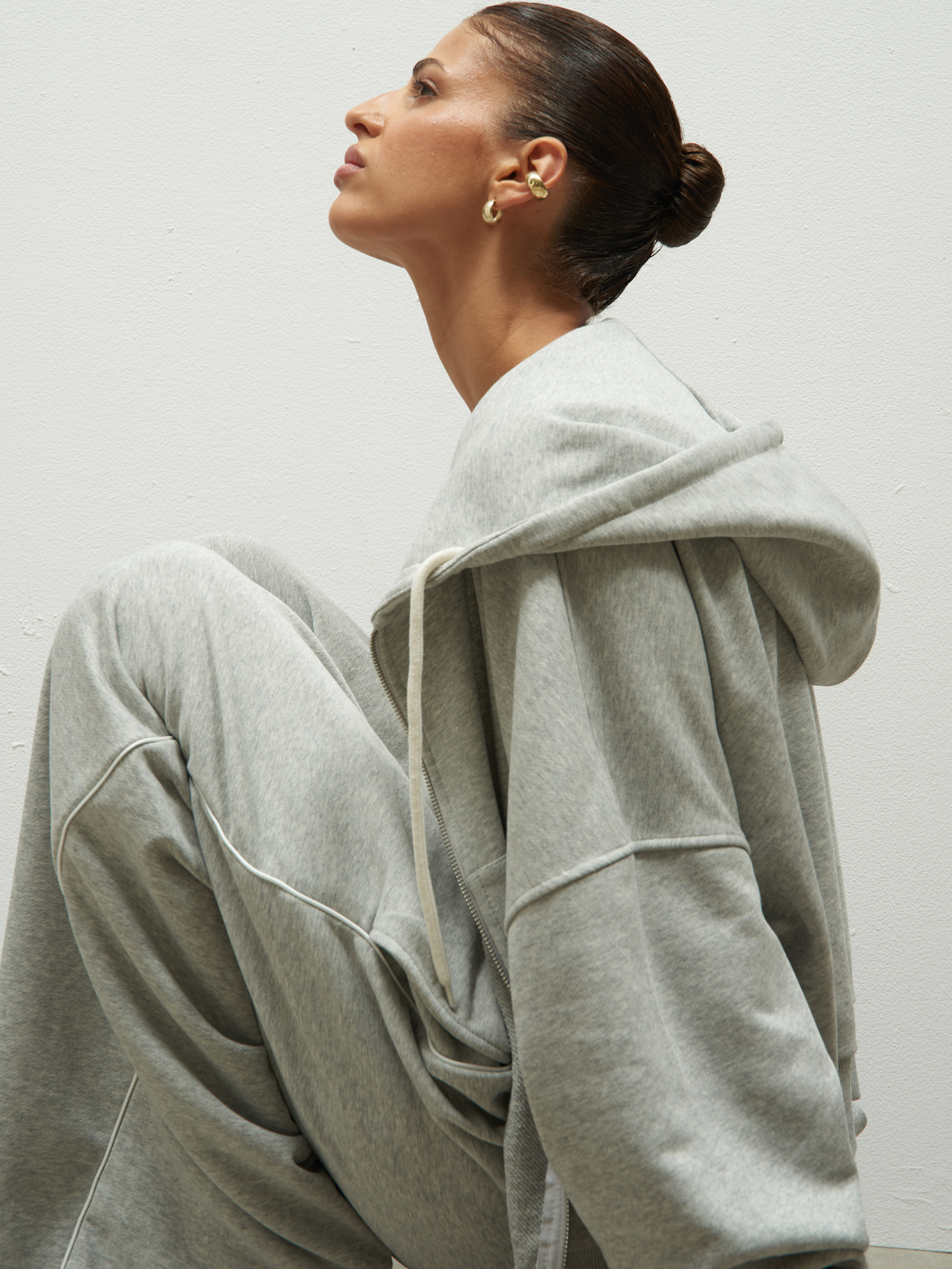 Krótka, pudełkowa bluza oversize z szerokim ściągaczem i obniżoną linią ramion. Jest zapinana na zamek i ma duży kaptur. Wykonana z ultra miękkiej bawełny, od wewnątrz wykończona pętelką. Połącz z dedykowanymi, szerokimi JOGGERAMI i stwórz zestaw idealny na wiosenno-letni sezon. Noś z jeansami lub ulubionymi spodniami i ciesz się sportową elegancją w najwygodniejszym wydaniu.