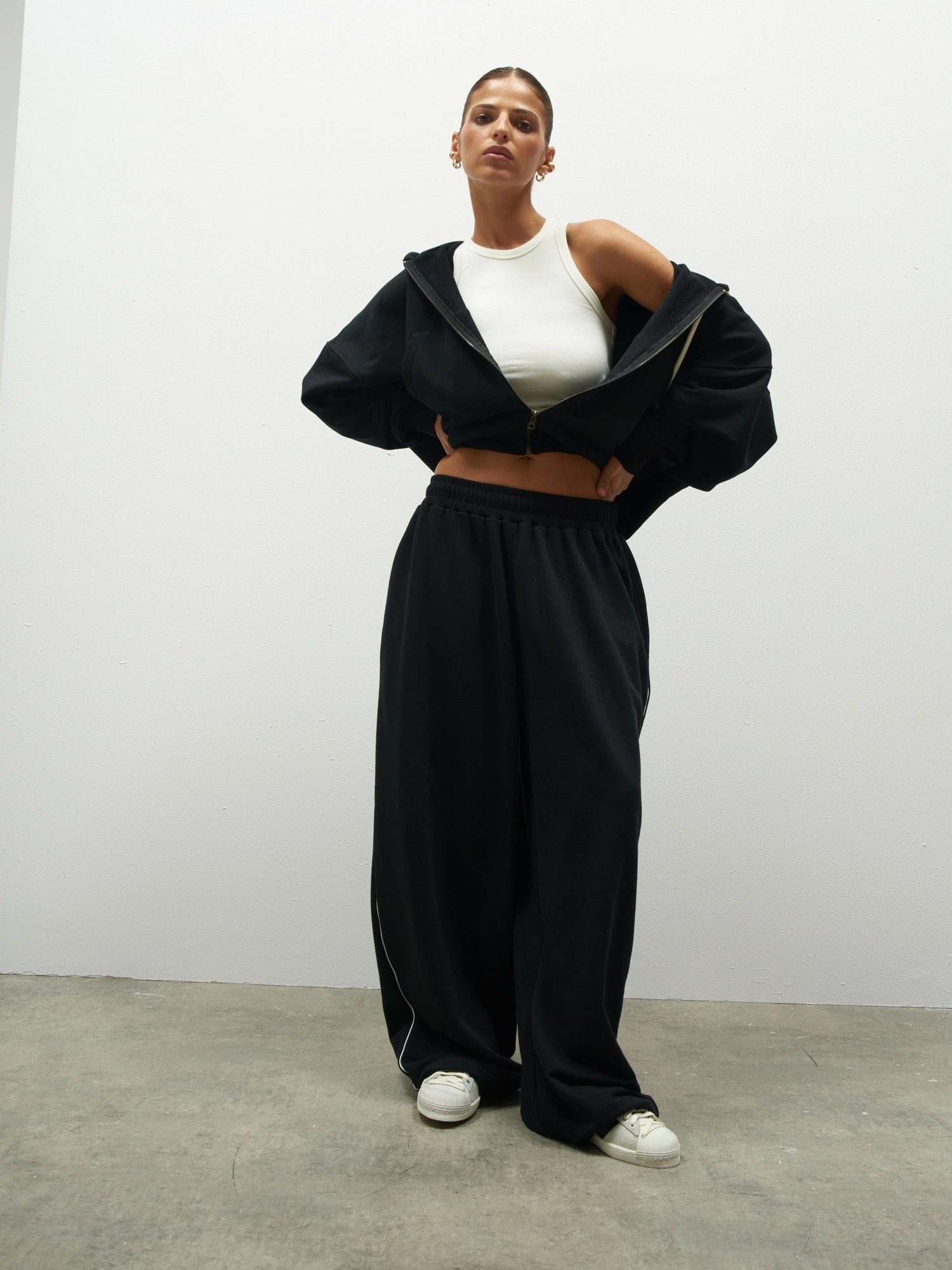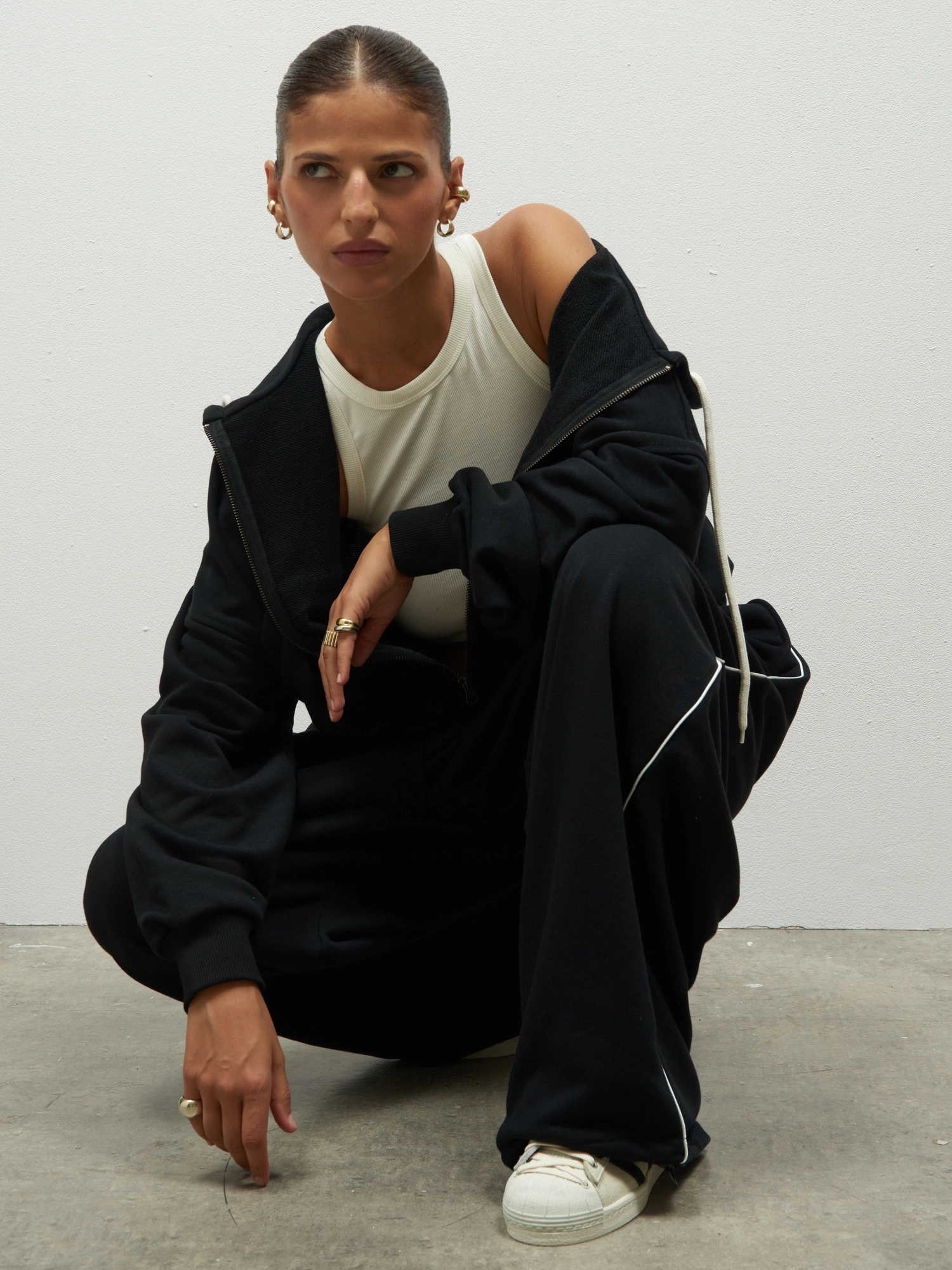 Szerokie spodnie dresowe wykonane z ultra miękkiej bawełny, wewnątrz wykończone pętelką. W pasie wygodna guma z dodatkowym wiązaniem, dzięki czemu możesz nosić je tak jak lubisz najbardziej - wyżej lub nisko na biodrach. Szerokie, wygodne nogawki, na dole z wąską gumką do ściągnięcia i ozdobnym lampasem po bokach. Łącząc z pudełkową bluzą na zamek lub z krótkim topem PADDED i skórzaną kurtką, stworzysz zestaw idealny na rozpoczęcie nowego sezonu.