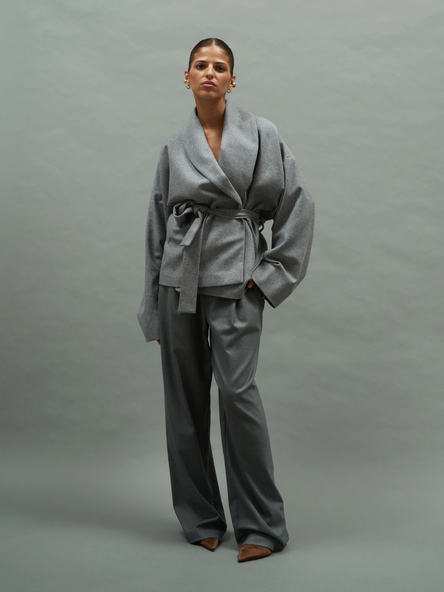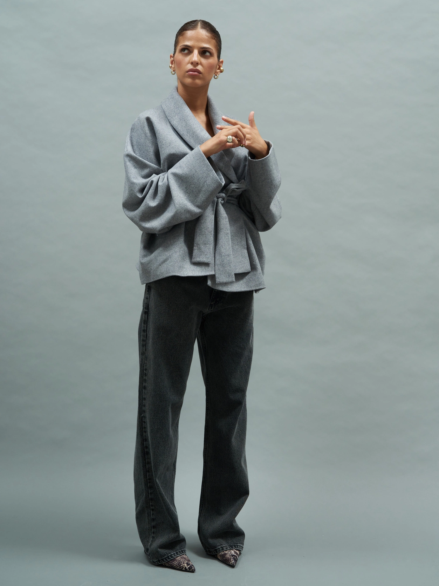 Kurtka o kroju kimono wykonana z wełny, wewnątrz wykończona podszewką z wiskozy. Ma wysoki kołnierz, a sama konstrukcja nadaje całości lekkości i swobody. Model wyposażony jest w pasek w talii, który pozwala na dopasowanie do sylwetki i podkreślenie jej naturalnych proporcji. To uniwersalny płaszczyk, który świetnie sprawdzi się zarówno w codziennych, jak i bardziej formalnych stylizacjach. Idealny wybór na chłodniejsze dni, łączący klasykę z nowoczesnym twistem.