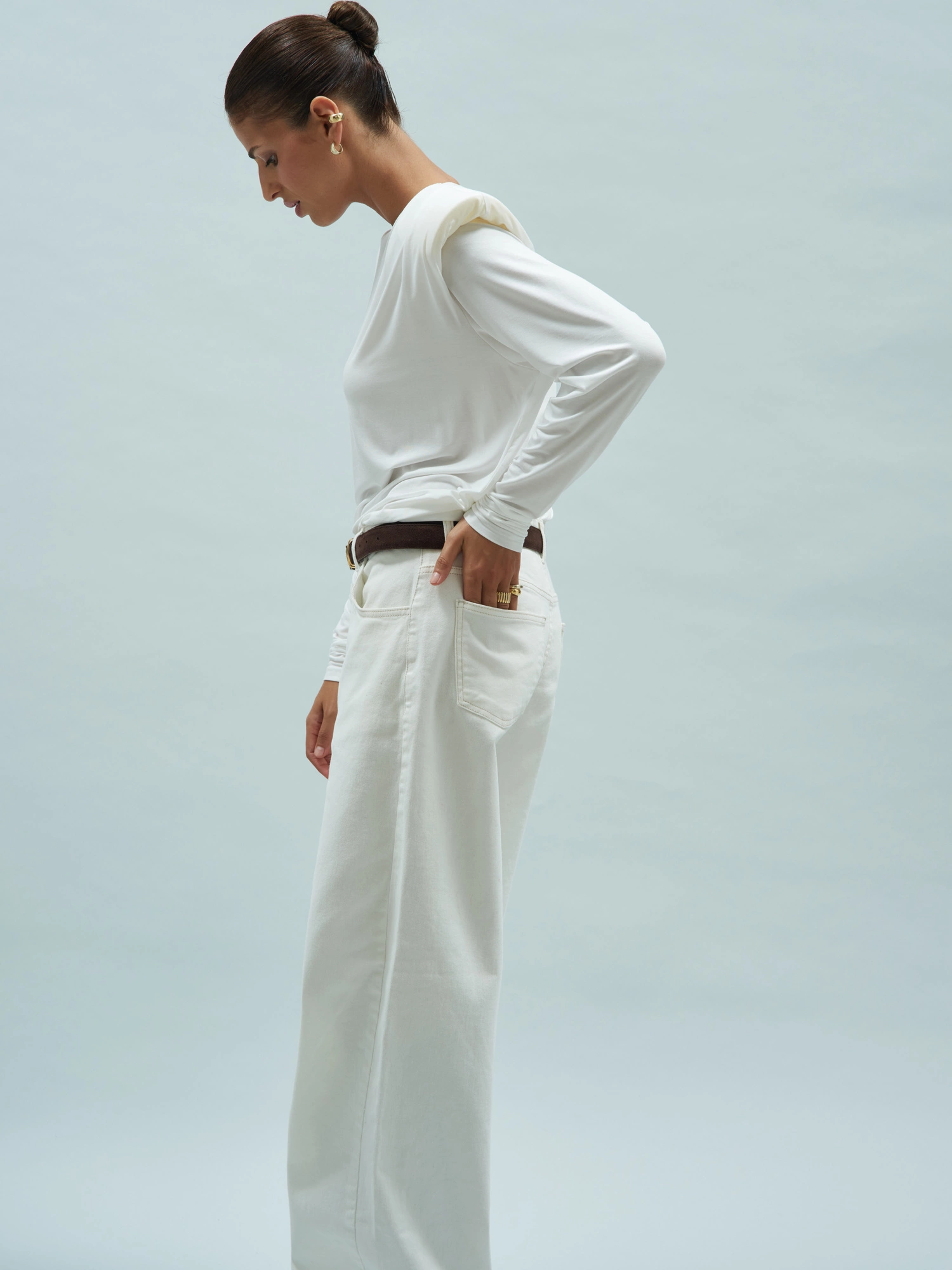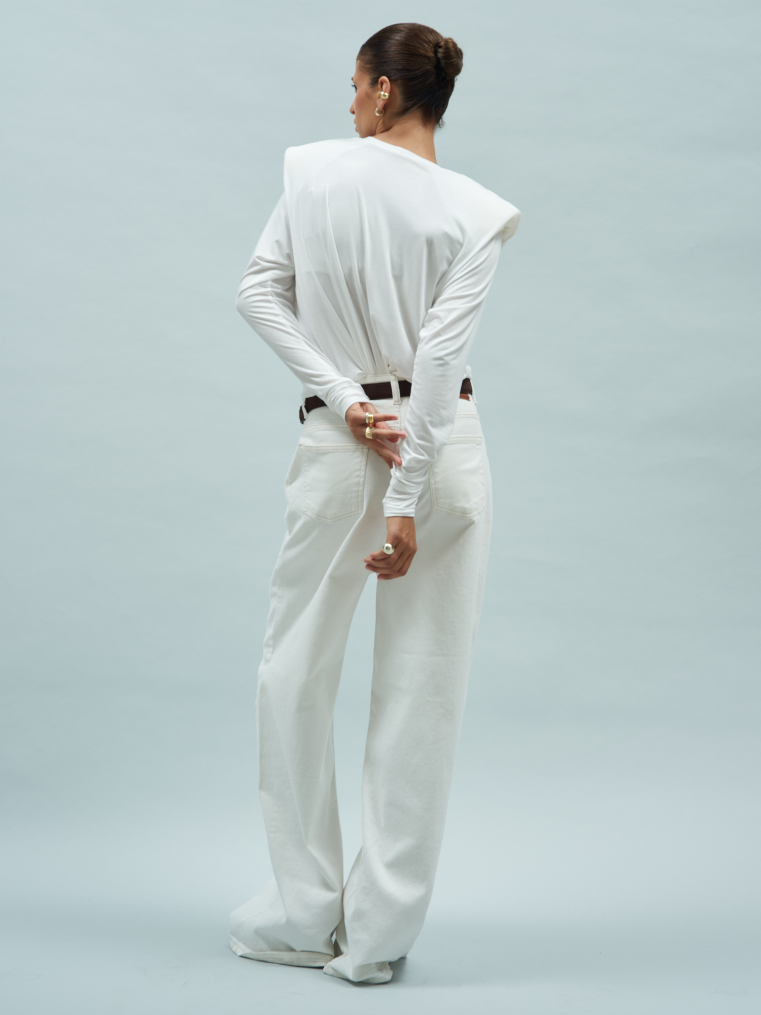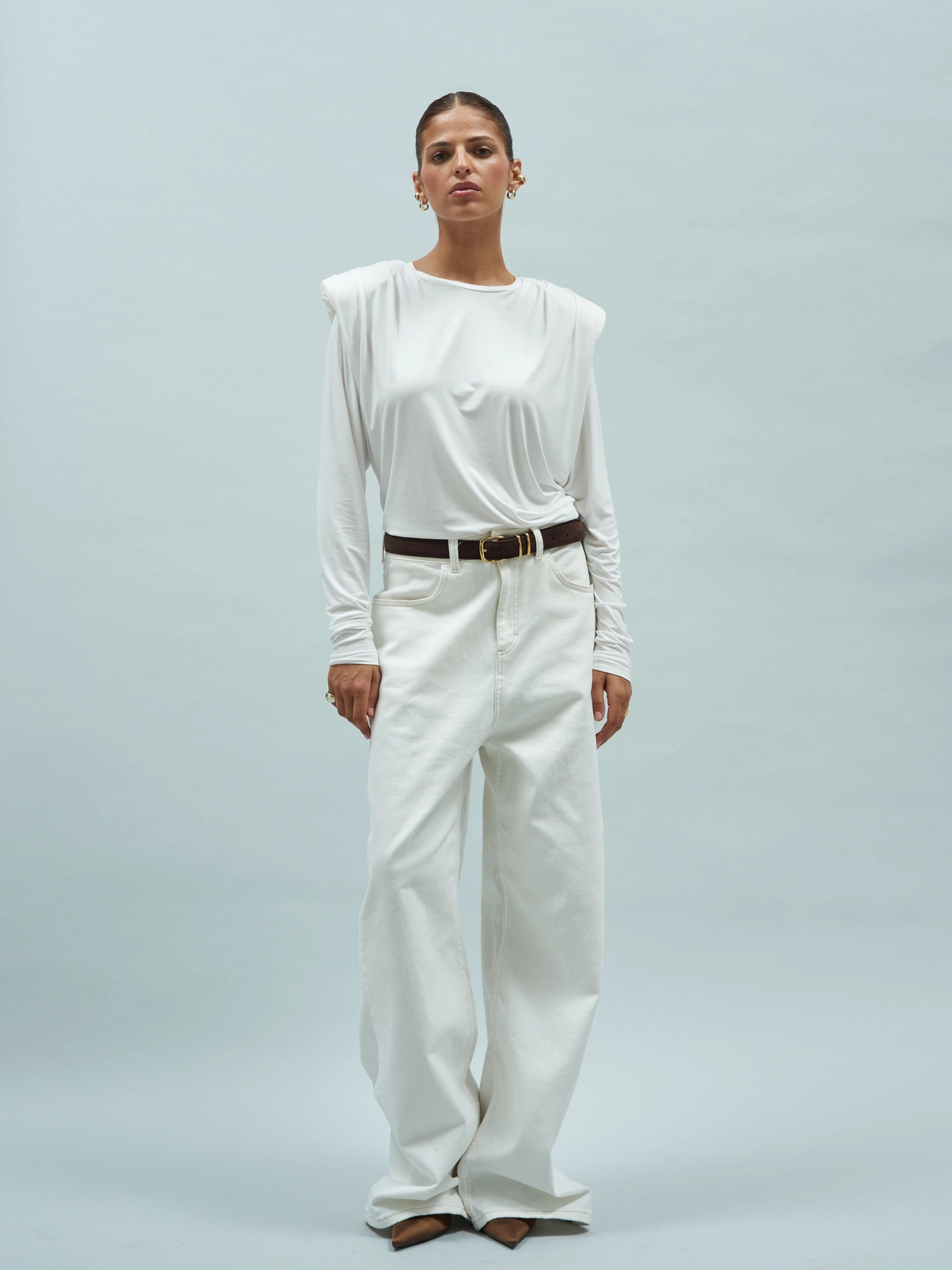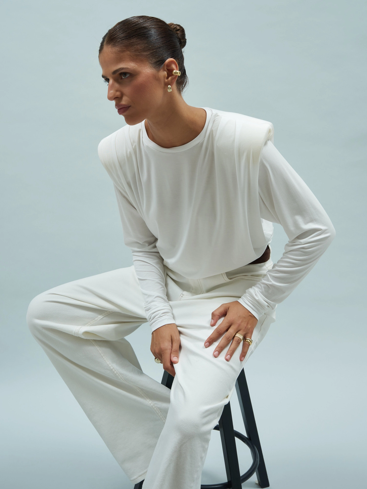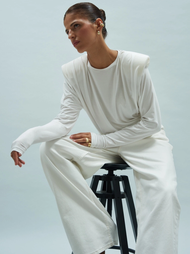Bluzka z poduszkami na ramionach o prostym, a jednocześnie unikatowym kroju. Uszyta z lekkiej i miękkiej dzianiny, dzięki czemu świetnie układa się na sylwetce i jest niezwykle delikatna dla Twojego ciała. Ma lekko oversize’owy fason z długim rękawem i okrągłym dekoltem. Świetnie sprawdzi się w połączeniu ze spodniami z wysokim stanem, jeansami lub elegancką spódnicą. Idealna baza do wielu stylizacji – od casualowych po bardziej wyjściowe. Ten model to kwintesencja minimalizmu z nutą nowoczesności.