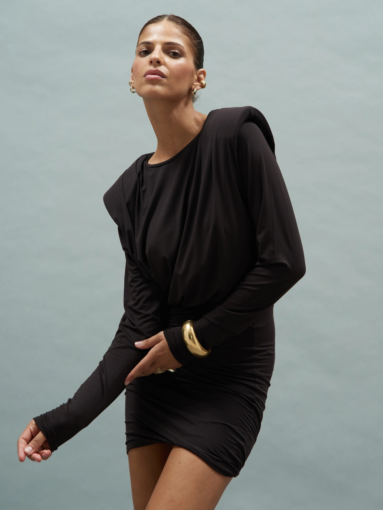 Sukienka mini inspirowana fasonem naszego bestsellerowego longsleeve’a KAIA. Góra ma prosty, lekko oversize’owy krój z długim rękawem i charakterystycznymi poduszkami. Uszyta z lekkiej i miękkiej dzianiny, która subtelnie otula sylwetkę i jest niezwykle delikatna dla ciała. Dół jest dopasowany, dzięki czemu całość pięknie podkreśla figurę i tworzy nowoczesny, zrównoważony kontrast. To uniwersalny model, który świetnie sprawdzi się zarówno w eleganckim wydaniu ze szpilkami, jak i w codziennej wersji z botkami czy sneakersami. Minimalistyczna forma z nutą wyrazistości sprawia, że ta sukienka to prawdziwy must-have w Twojej garderobie.