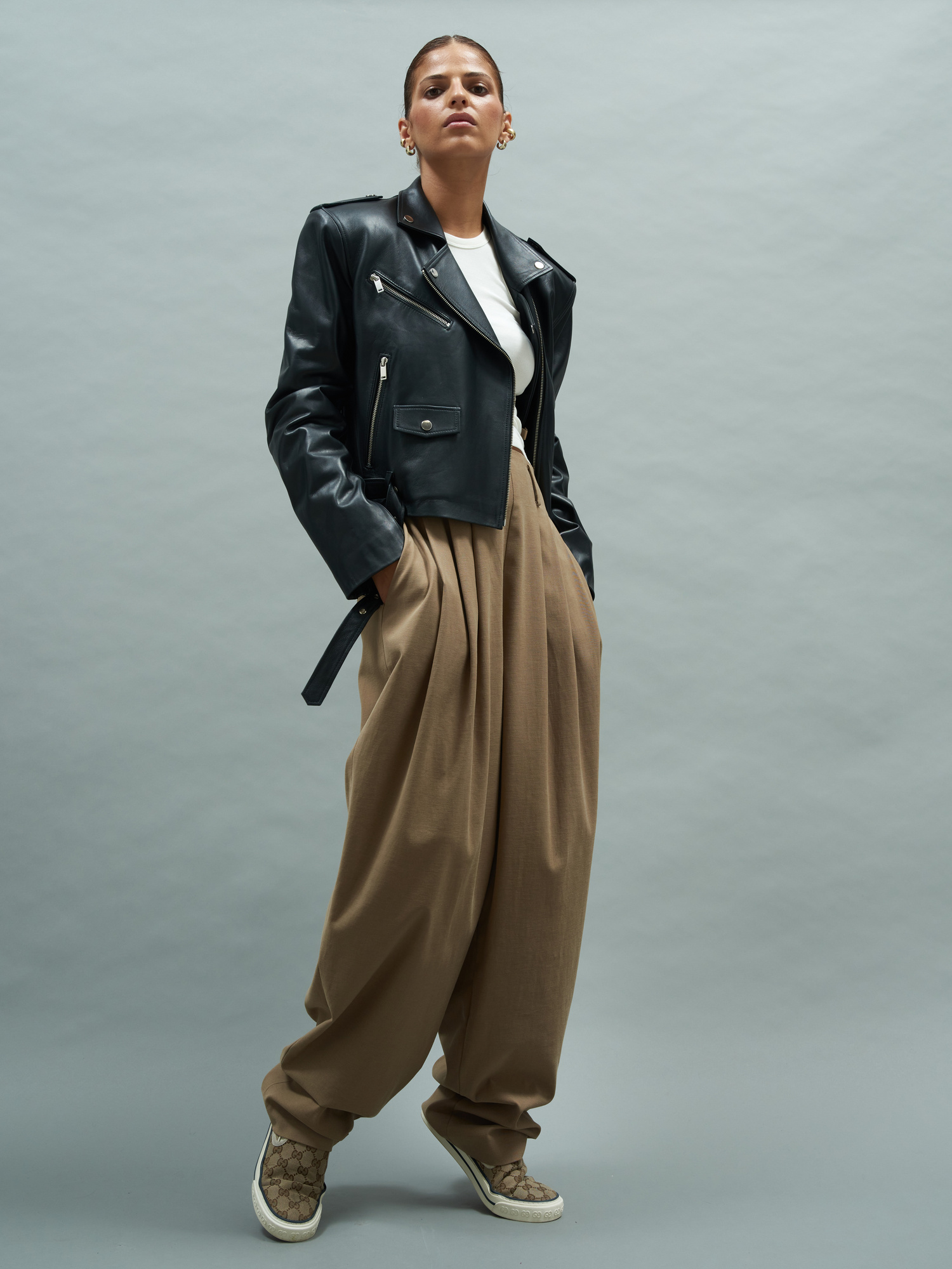 Stylizowane na męskie spodnie, wykonane ze sztywniejszej, ale miękkiej tkaniny - trwałej i idealnej na nadchodzący sezon. Spodnie mają podwyższony stan, który świetnie układa się w pasie, a luźne, delikatnie zwężane ku dołowi nogawki zapewniają wygodę i swobodę ruchów. Prostotę projektu przełamują zakładki na przodzie, które nadają im charakterystycznej formy i podkręcają styl. Idealne na co dzień, do pracy, a z odpowiednimi dodatkami nawet na bardziej eleganckie wyjścia. Noś ze sneakersami, szpilkami czy botkami.