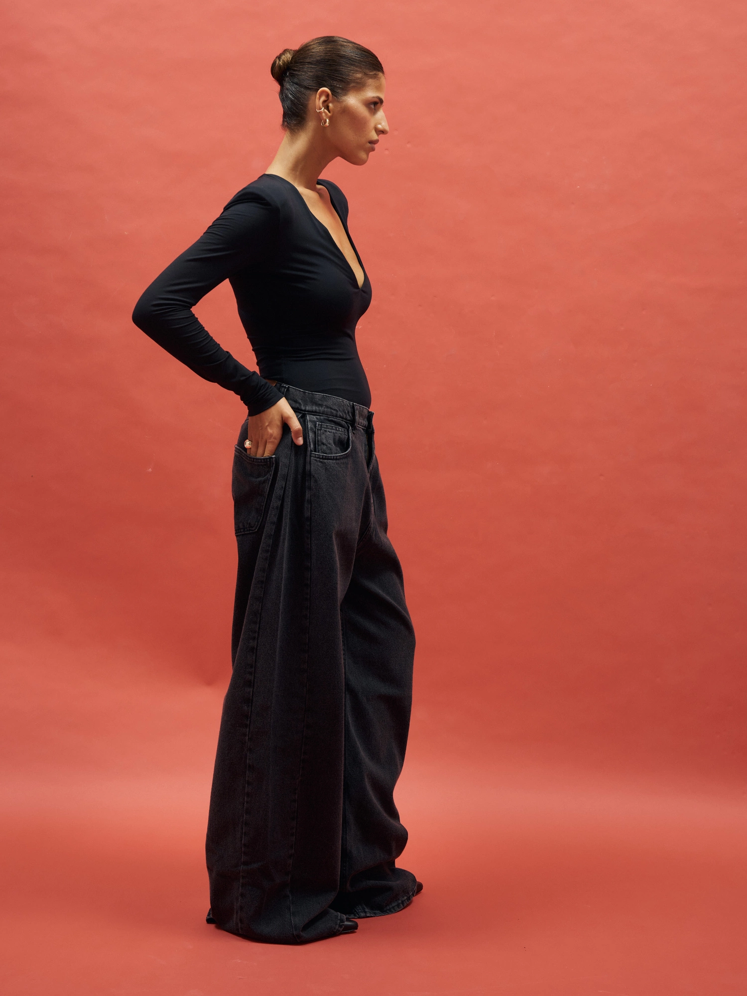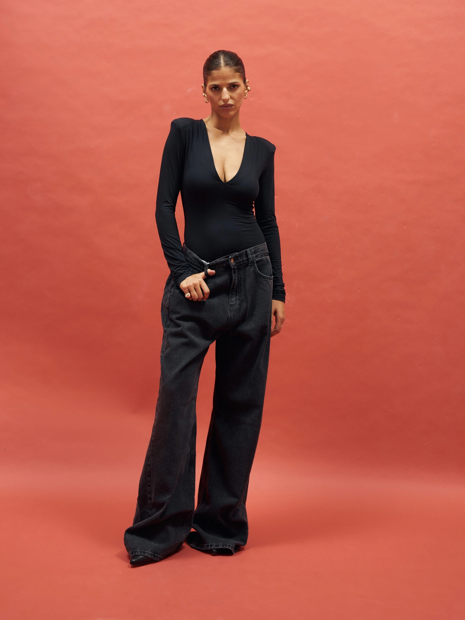 Dopasowane body z długim rękawem i głębokim dekoltem w kształcie litery V. Zmysłowo podkreśla ciało, a poduszki na ramionach nadają całości eleganckiego charakteru. To propozycja, która świetnie prezentuje się w połączeniu ze skórzanymi spodniami, spódnicą czy luźnymi jeansami. Proste, minimalistyczne, ale z charakterem - wystarczy dodać ulubioną biżuterię i dodatki.