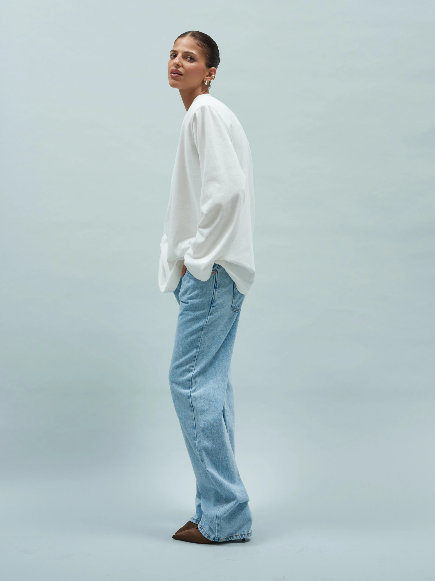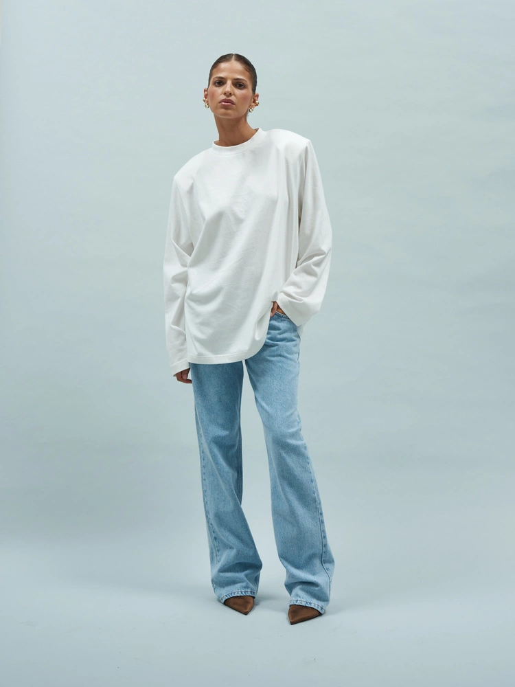 Klasyczny longsleeve utrzymany w fasonie oversize. Ma długie rękawy i mocne ramiona podkreślone odpinanymi poduszkami. Wykonany w 100% z bawełny, dzięki czemu jest miękki, oddychający, a przede wszystkim wygodny. Jest idealną propozycją do codziennych, jak i bardziej eleganckich stylizacji - w połączeniu z dżinsami czy luźniejszymi spodniami materiałowymi. To basic podkręcony wyrazistym detalem, który idealnie sprawdzi się w każdej szafie kapsułowej.