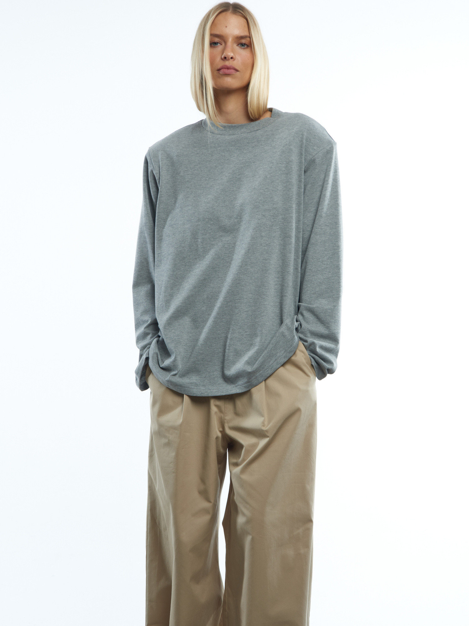Klasyczny longsleeve utrzymany w fasonie oversize. Ma długie rękawy i mocne ramiona podkreślone odpinanymi poduszkami. Wykonany w 100% z bawełny, dzięki czemu jest miękki, oddychający, a przede wszystkim wygodny. Jest idealną propozycją do codziennych, jak i bardziej eleganckich stylizacji - w połączeniu z dżinsami czy luźniejszymi spodniami materiałowymi. To basic podkręcony wyrazistym detalem, który idealnie sprawdzi się w każdej szafie kapsułowej.