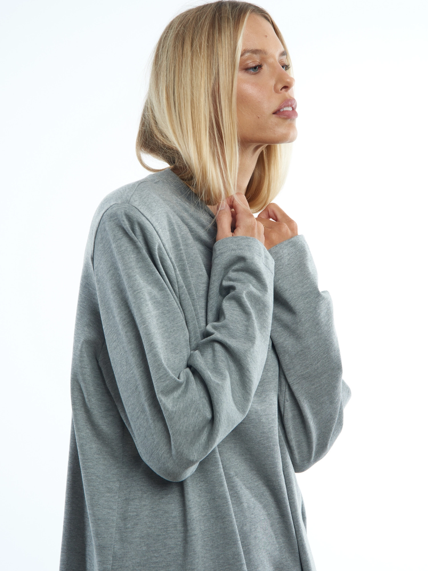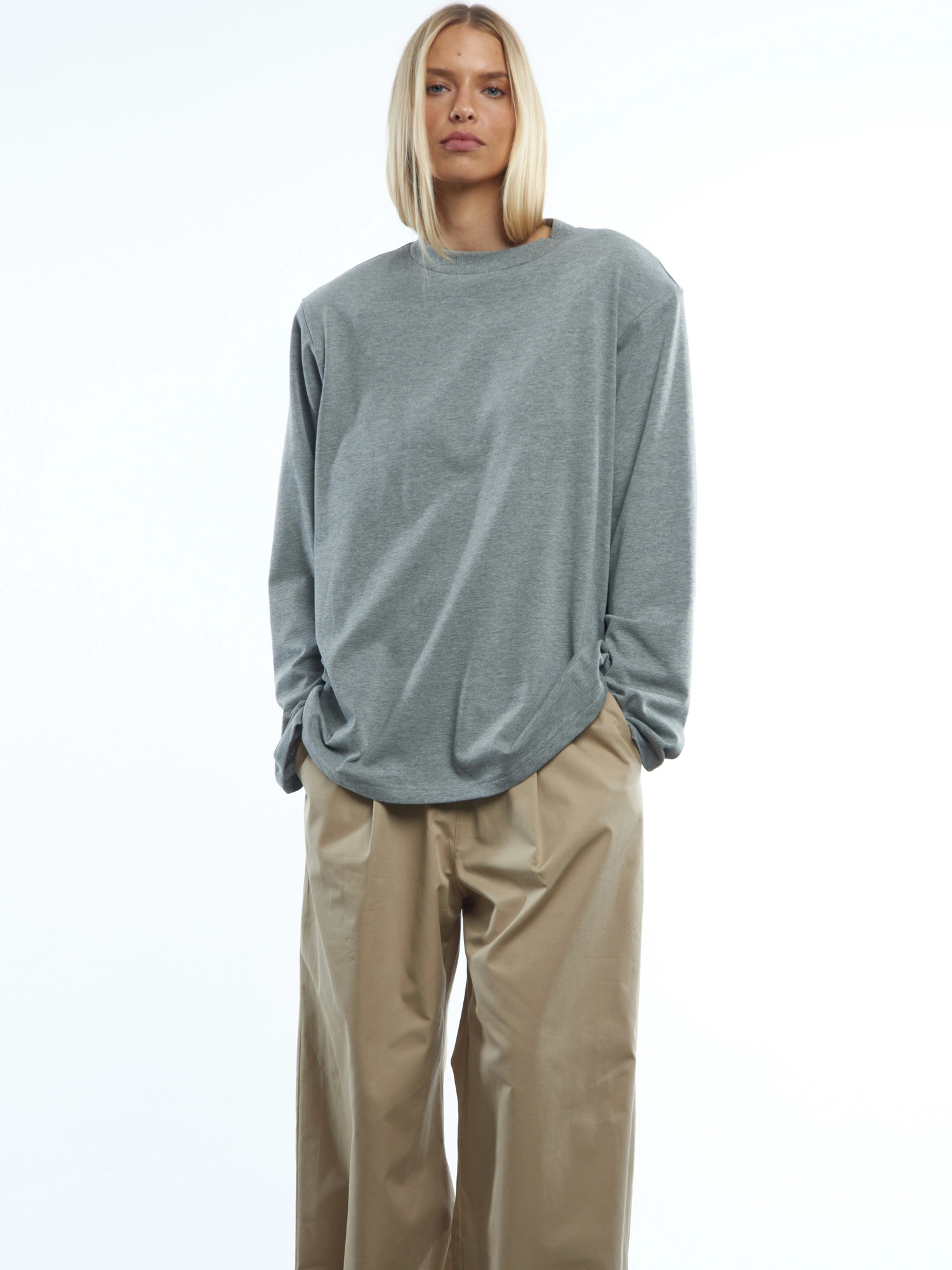 Klasyczny longsleeve utrzymany w fasonie oversize. Ma długie rękawy i mocne ramiona podkreślone odpinanymi poduszkami. Wykonany w 100% z bawełny, dzięki czemu jest miękki, oddychający, a przede wszystkim wygodny. Jest idealną propozycją do codziennych, jak i bardziej eleganckich stylizacji - w połączeniu z dżinsami czy luźniejszymi spodniami materiałowymi. To basic podkręcony wyrazistym detalem, który idealnie sprawdzi się w każdej szafie kapsułowej.
