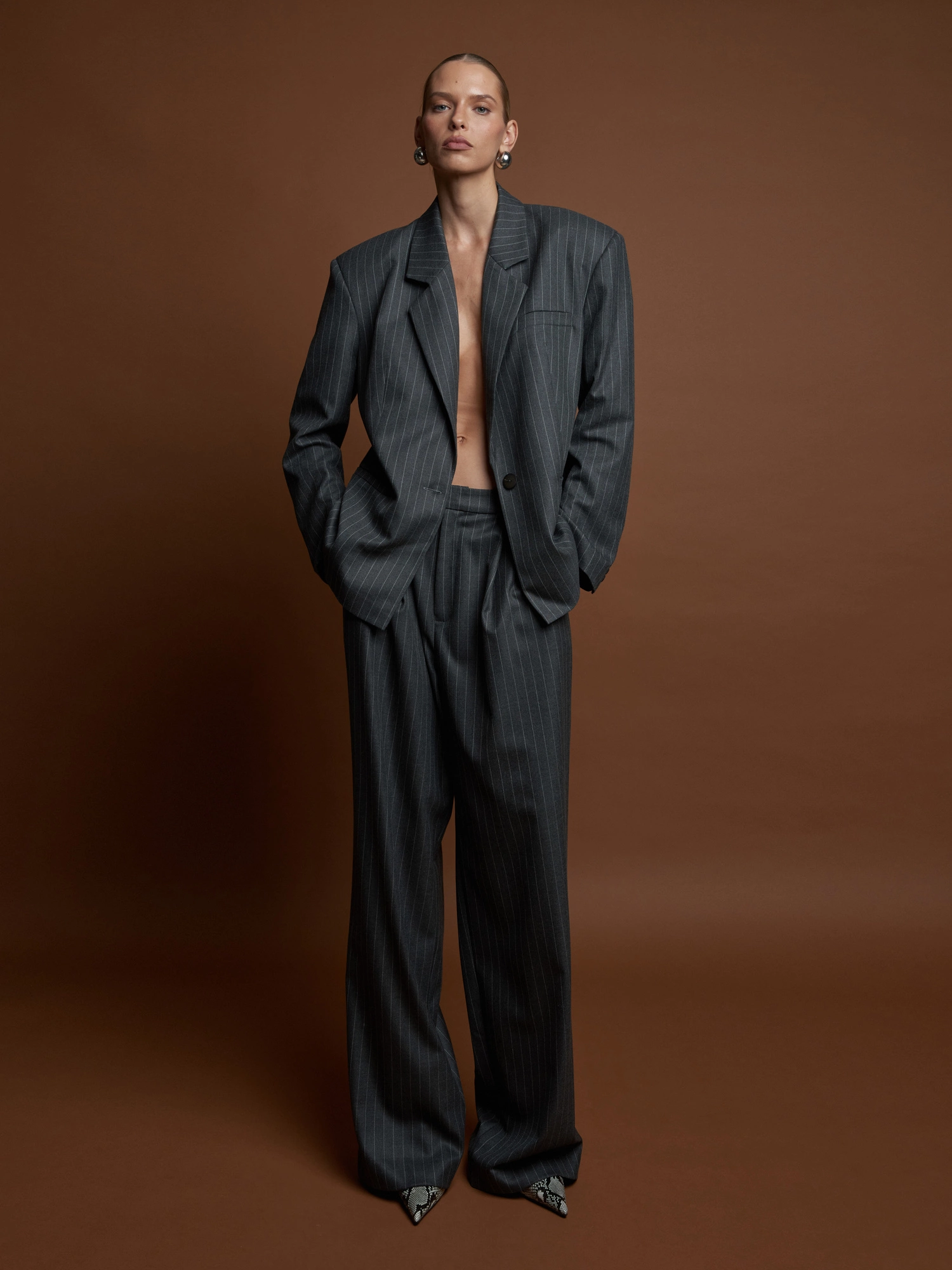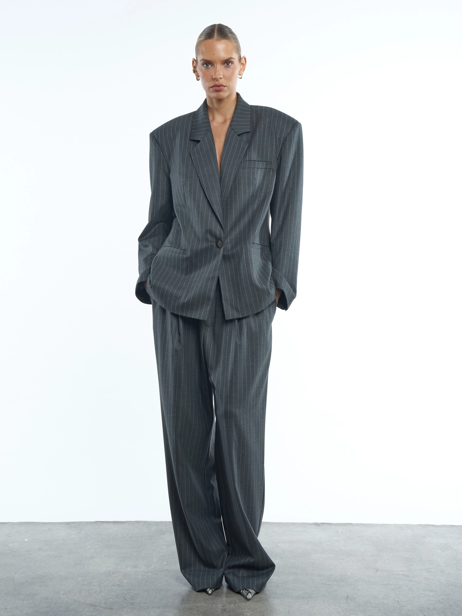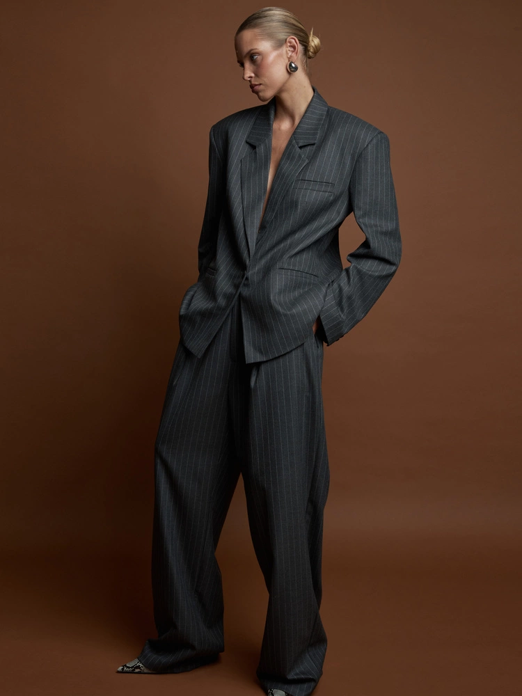 Garniturowe spodnie uszyte z miękkiego materiału w szarym odcieniu z delikatnym, tenisowym prążkiem. Stylizowane na męskie - mają obniżony stan, proste, szerokie nogawki i dwie zakładki na przodzie. Są idealnym dopełnieniem eleganckiej stylizacji z marynarką, ale sprawdzą się równie dobrze w wersji codziennej z basicowym topem, klasyczną koszulą lub jeansową kurtką. To ponadczasowy i wygodny krój - stylizuj jak chcesz w zależności od okazji i potrzeby.