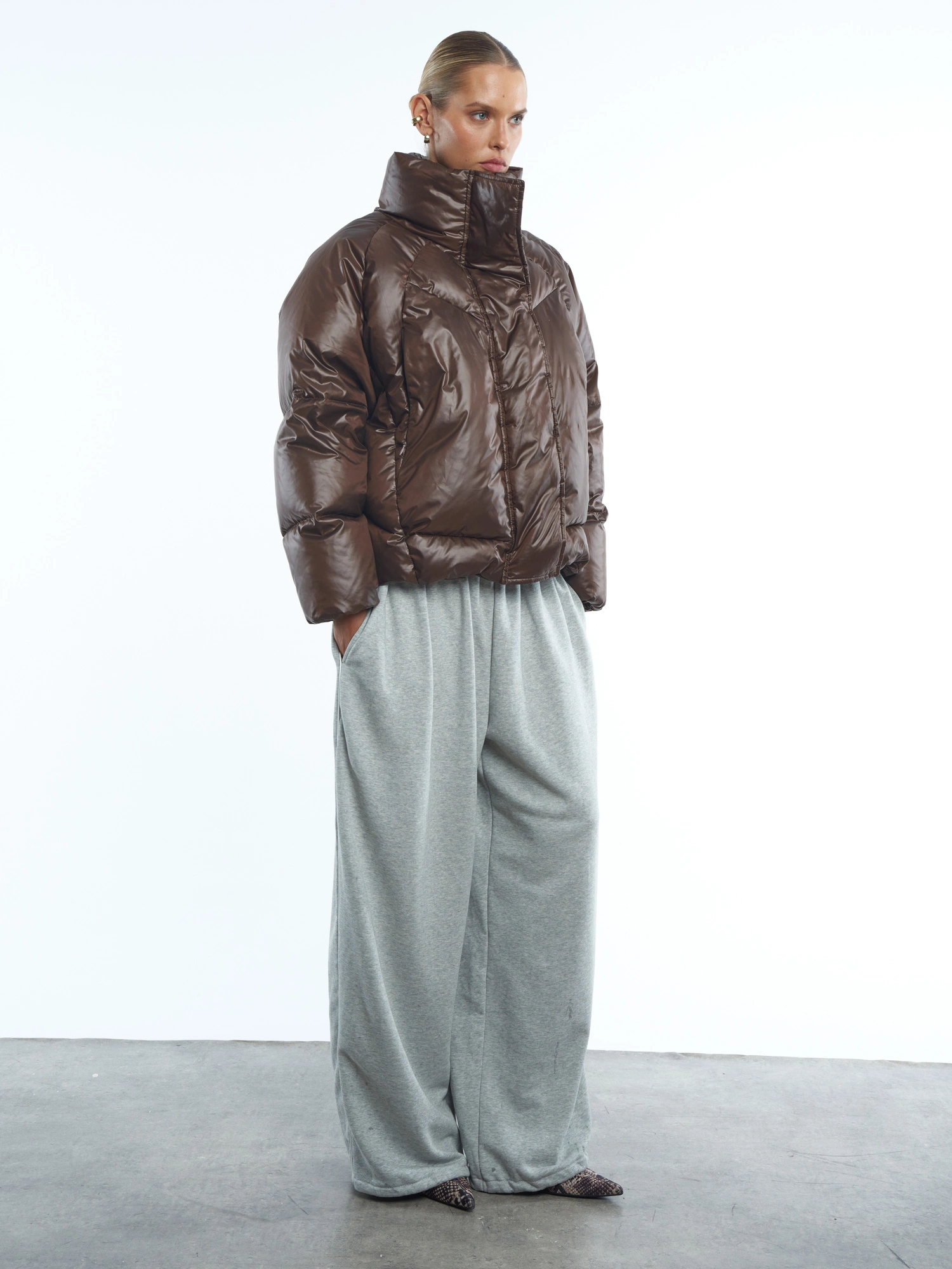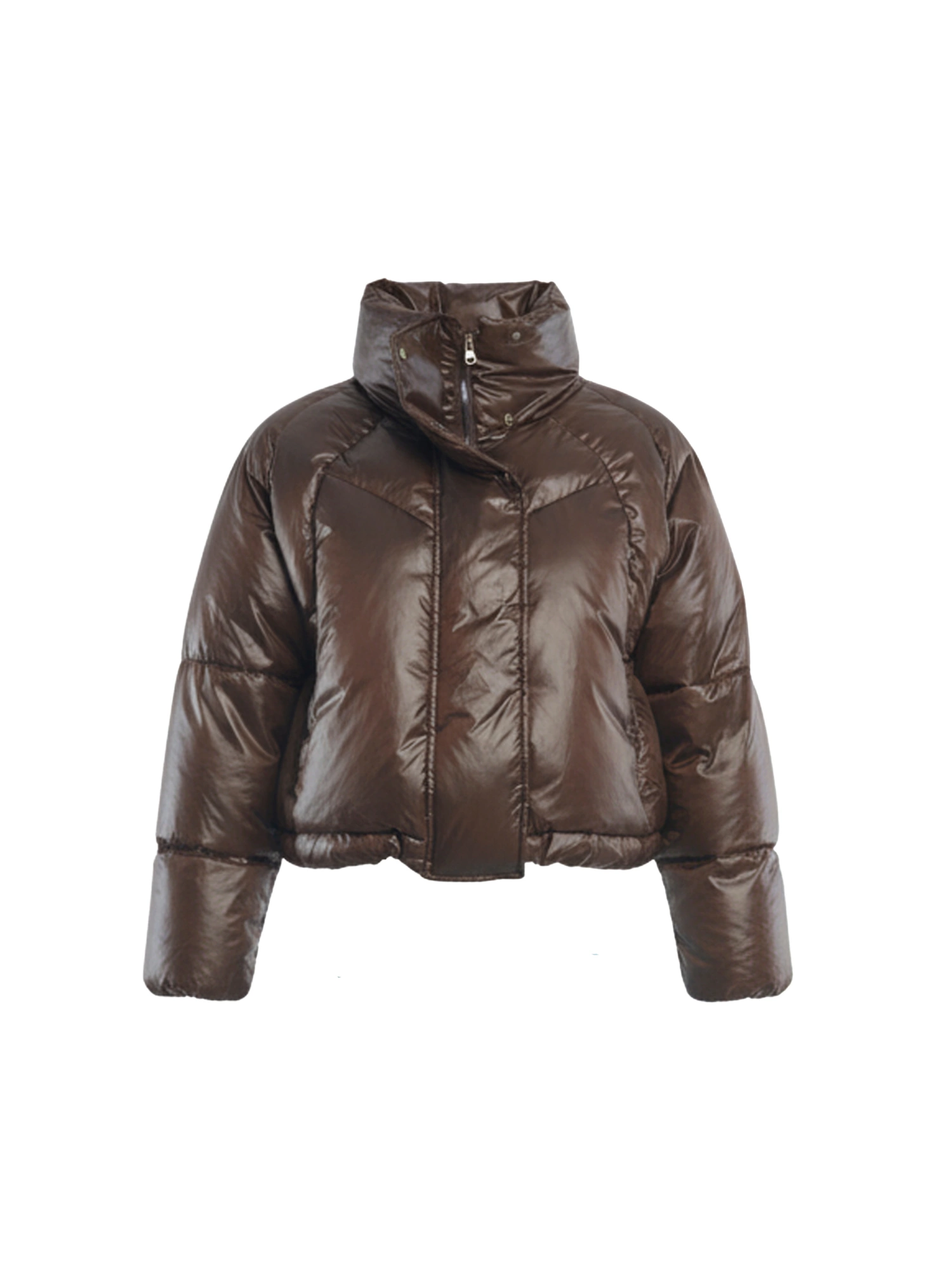 Krótka kurtka puchowa o pudełkowym fasonie, utrzymana w kroju oversize. Ma długie rękawy i wysoki, otulający szyję kołnierz. Zapinana jest na zamek błyskawiczny oraz napy. Dzięki regulowanemu ściągaczowi w pasie możesz bawić się formą – nosić kurtkę swobodnie lub nadać jej nowoczesny krój bombki.