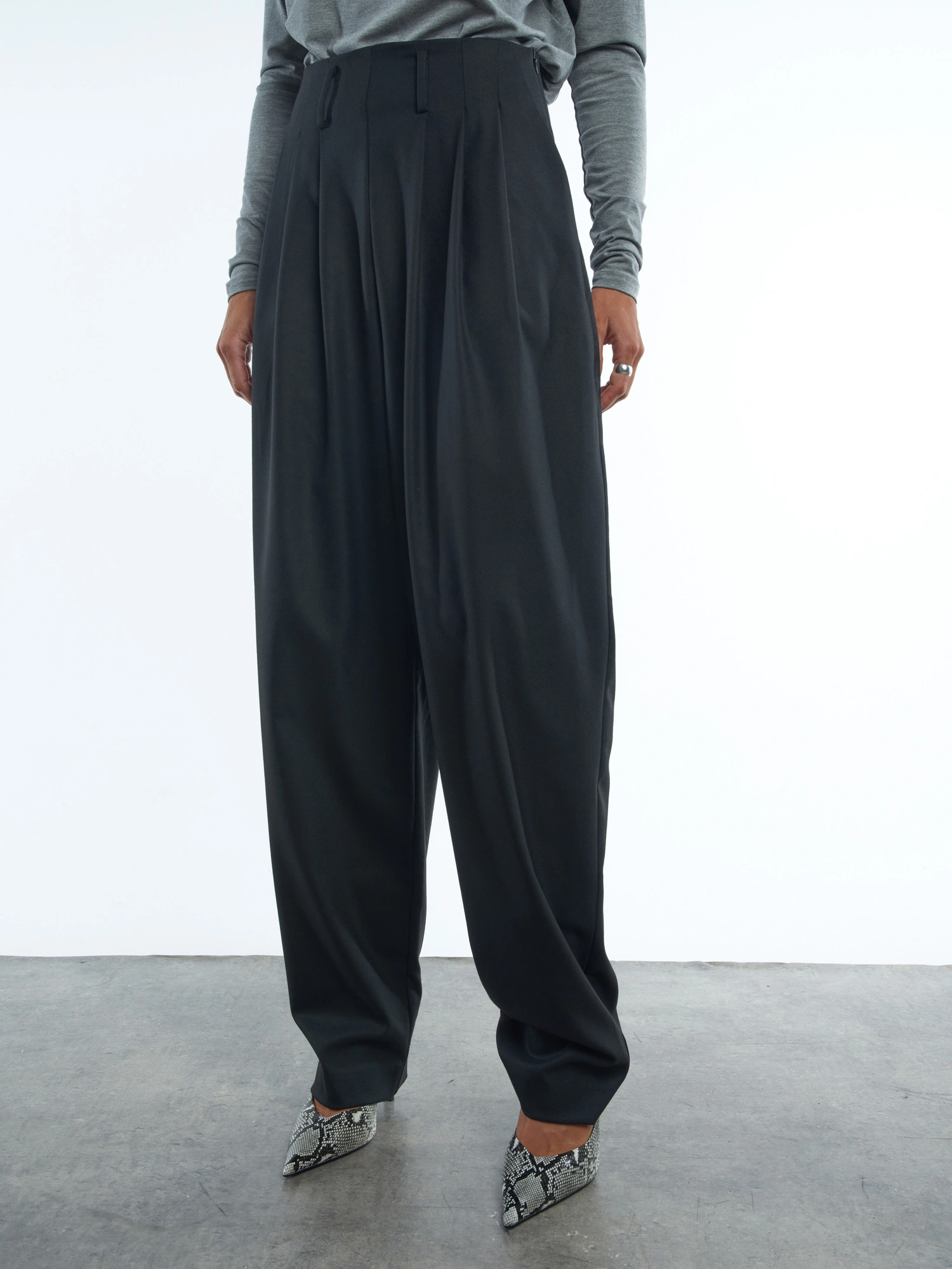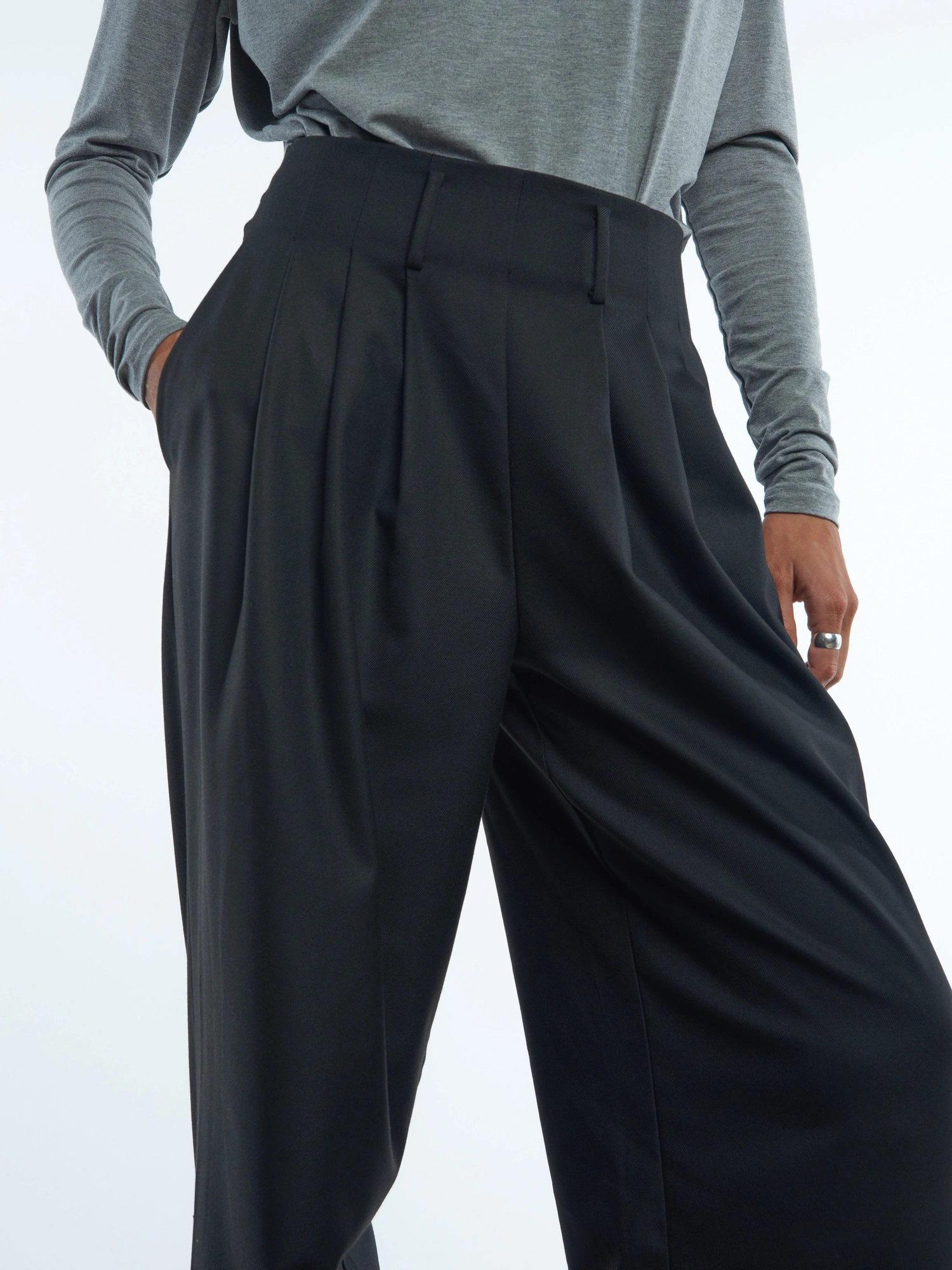 Stylizowane na męskie spodnie, wykonane ze sztywniejszej, ale miękkiej tkaniny - trwałej i idealnej na ten sezon. Spodnie mają podwyższony stan, który świetnie układa się w pasie, a luźne, delikatnie zwężane ku dołowi nogawki zapewniają wygodę i swobodę ruchów. Prostotę projektu przełamują zakładki na przodzie, które nadają im charakterystycznej formy i podkręcają styl. Idealne na co dzień, do pracy, a z odpowiednimi dodatkami na bardziej eleganckie wyjścia. Noś ze sneakersami, szpilkami czy botkami.