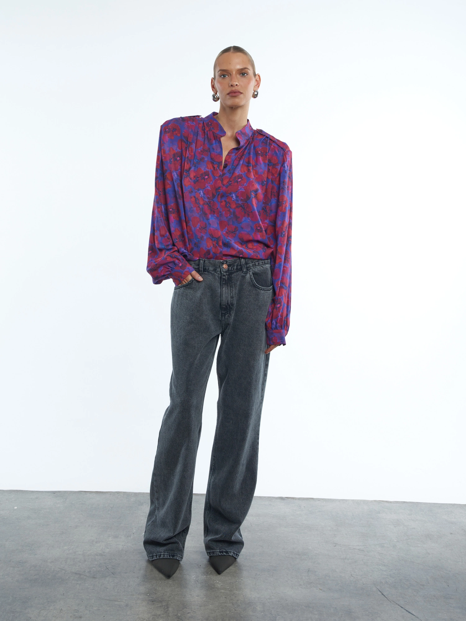 Koszula ze stójką o prostym, pudełkowym fasonie, która łączy w sobie kobiecość i wyrazisty charakter. Uszyta z miękkiej wiskozowej tkaniny o intensywnym, kwiatowym princie. Jej klasyczny krój przełamują mocne ramiona z wszytymi poduszkami, marszczeniem i pagonami. Ma szerokie, bufiaste rękawy zakończone wąskim mankietem, które nadają koszuli lekkości. To propozycja idealna zarówno na co dzień, jak i na wyjątkowe okazje – zestawiona z jeansami doda szyku, a w połączeniu z eleganckimi spodniami czy spódnicą stworzy stylizację pełną klasy.