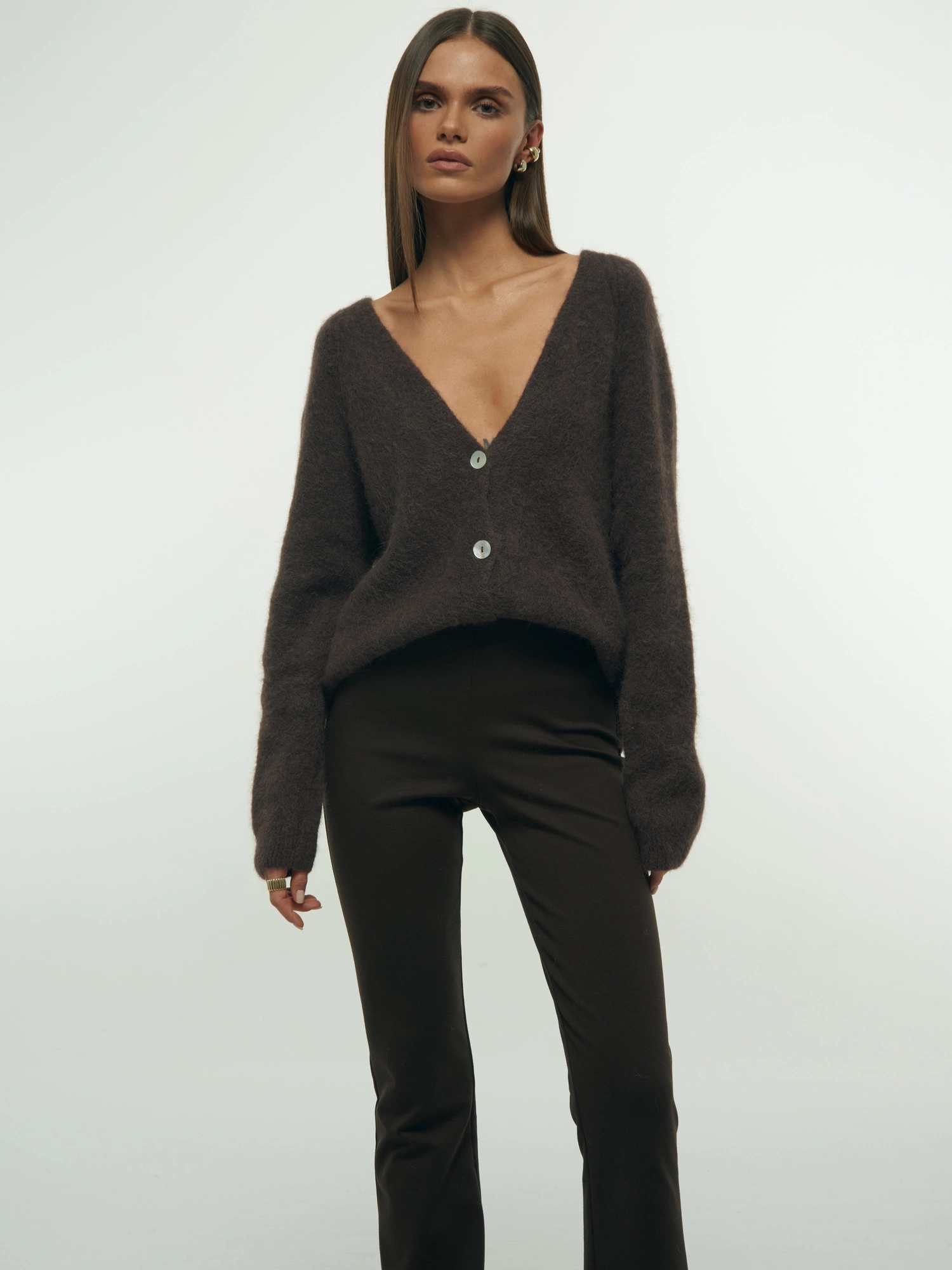 Sweter o klasycznym i prostym kroju zapinany na guziki. Ma dekolt w kształcie litery V oraz długie rękawy. Dzięki zawartości wełny baby alpaka oraz wełny dziewiczej jest wyjątkowo ciepły, lekki i przyjemny w dotyku. Nie gryzie, pięknie układa się na sylwetce i otula komfortem w chłodniejsze dni. Jego minimalistyczny, ponadczasowy krój sprawia, że pasuje zarówno do codziennych, jak i bardziej eleganckich stylizacji. Noś go z ulubionymi jeansami, materiałowymi spodniami lub elegancką spódnicą – sprawdzi się w każdej wersji.
