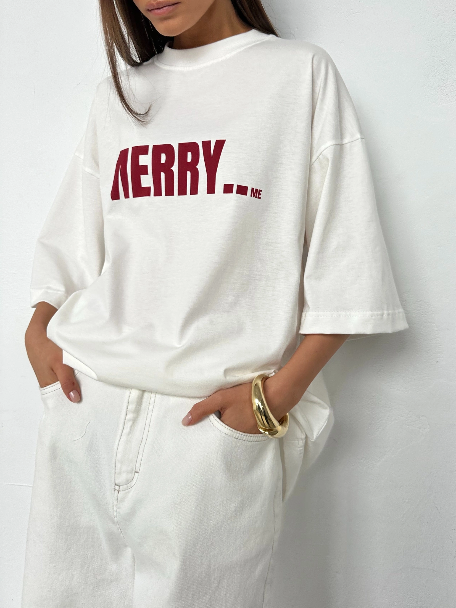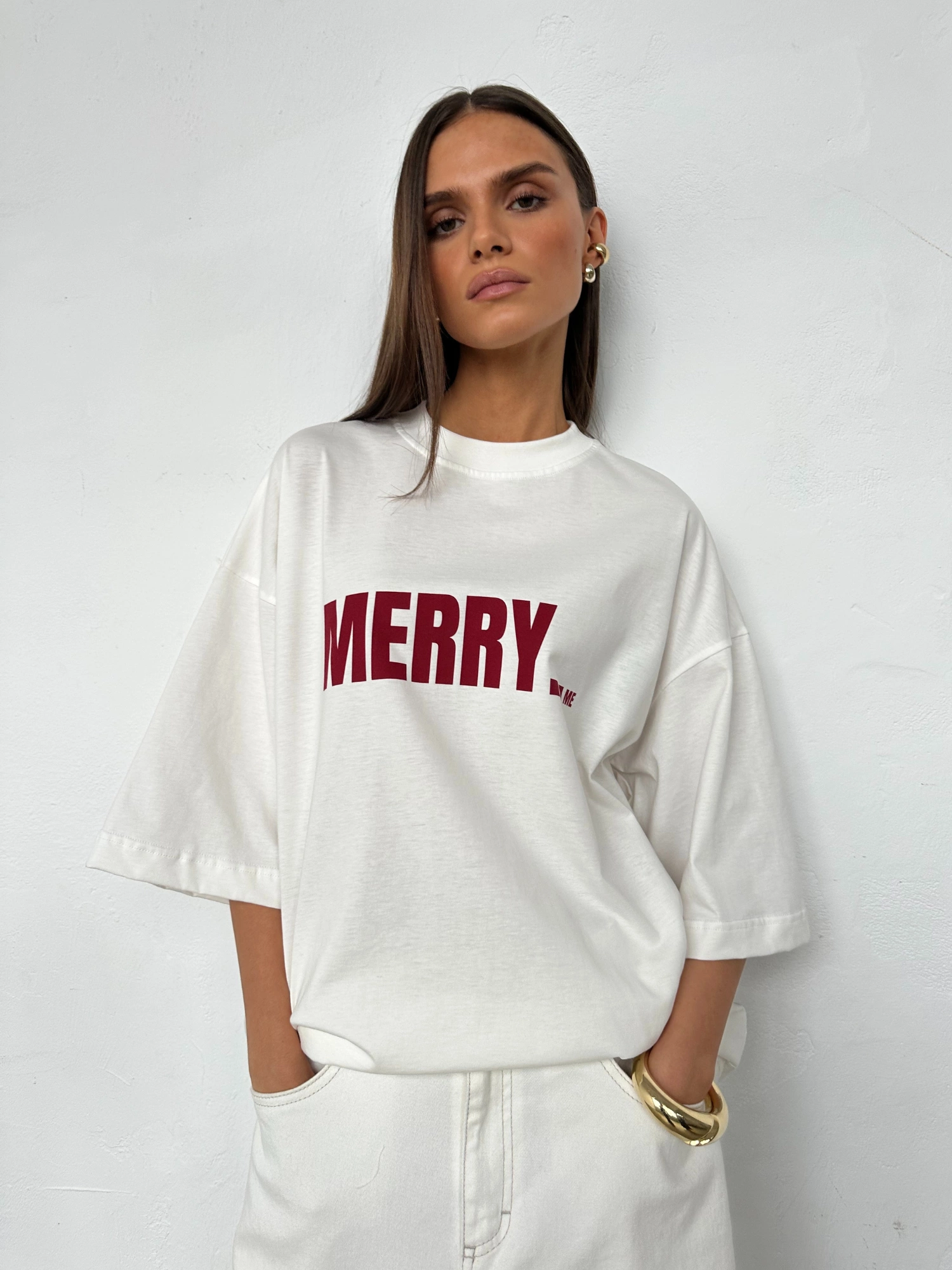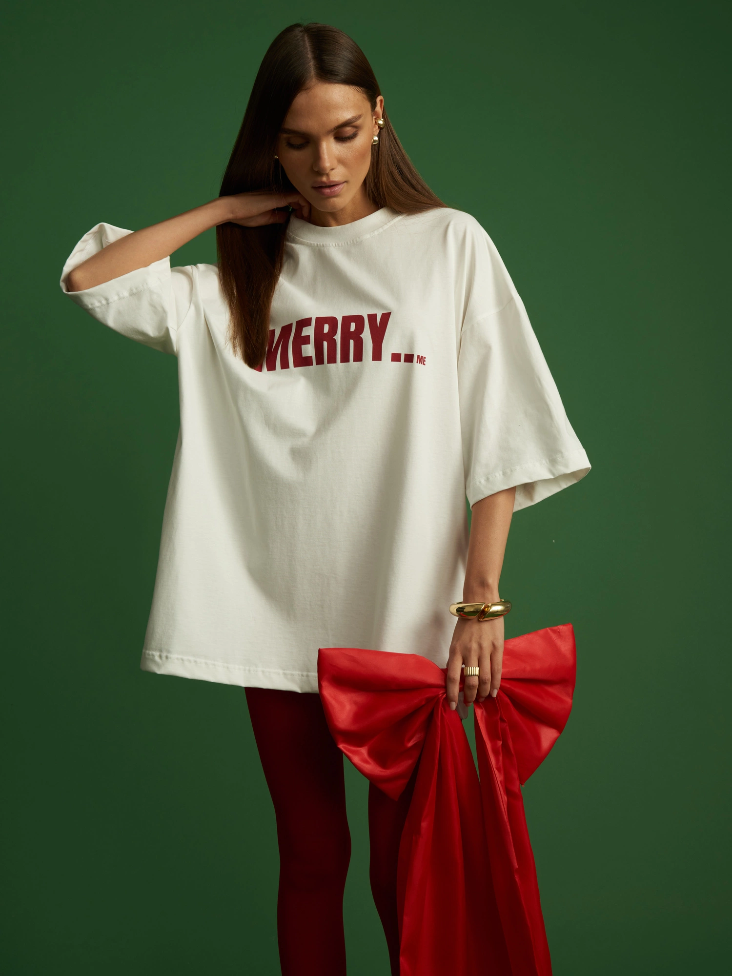 T-shirt oversize wykonany w 100% z miękkiej, wysokogatunkowej bawełny. Luźny krój i wyrazisty nadruk “Merry... Me” nadają mu swobodny, streetwearowy charakter. Komfortowy, stylowy i z dystansem – noś go tak, jak lubisz: do jeansów, legginsów lub jako przełamanie eleganckiej stylizacji ze spódnicą lub garniturowymi spodniami.