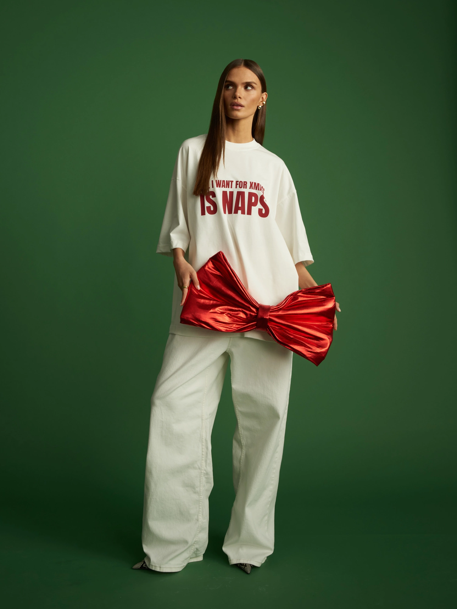 T-shirt oversize wykonany w 100% z miękkiej, wysokogatunkowej bawełny. Luźny krój i wyrazisty nadruk “All I want for Xmass is NAPS” nadają mu swobodny, streetwearowy charakter. Komfortowy, stylowy i z dystansem – noś go tak, jak lubisz: do jeansów, legginsów lub jako przełamanie eleganckiej stylizacji ze spódnicą lub garniturowymi spodniami.