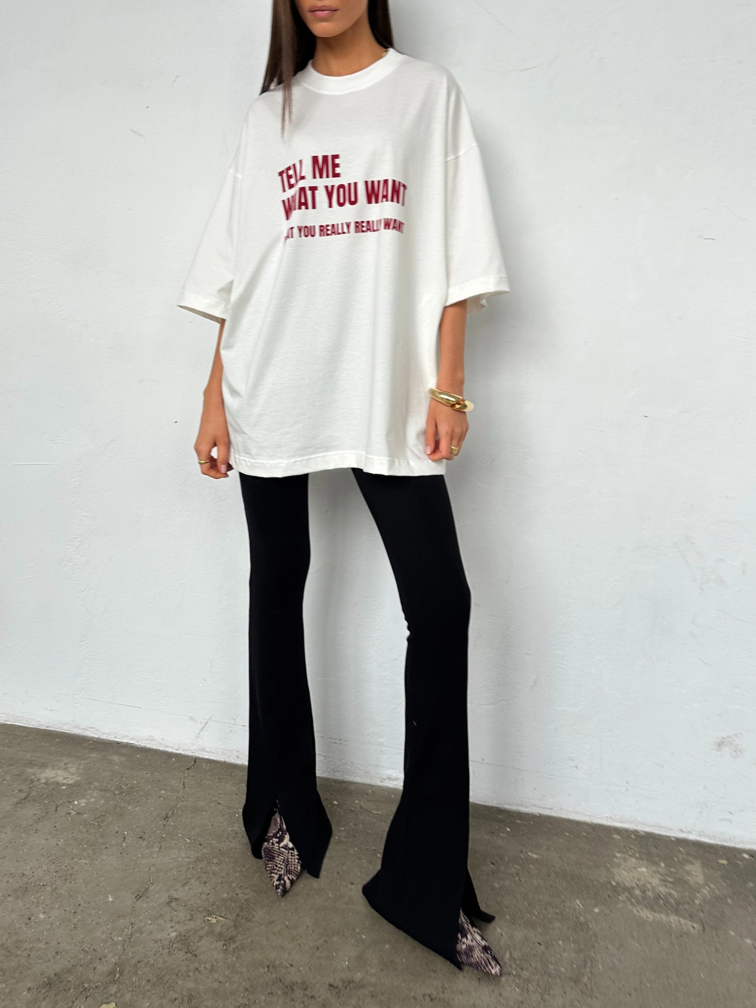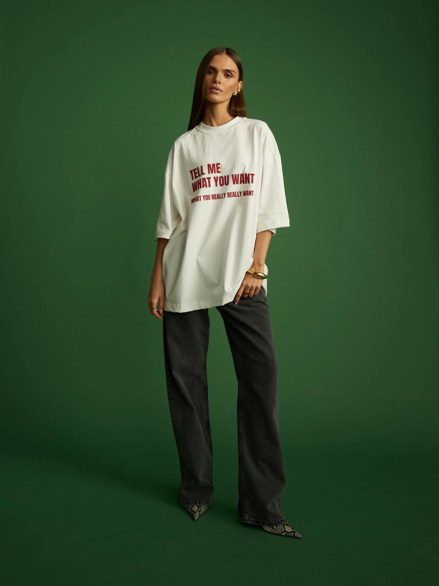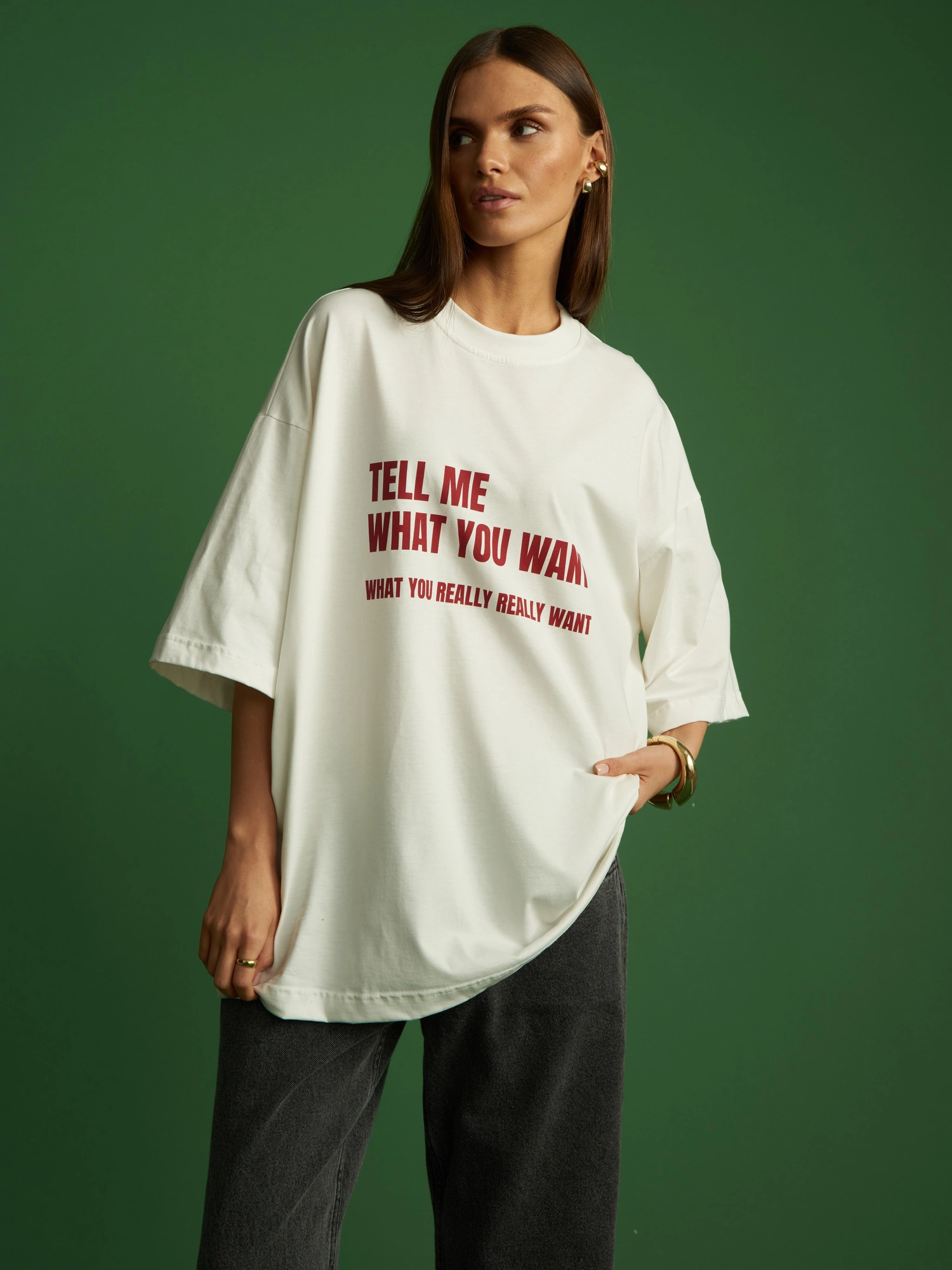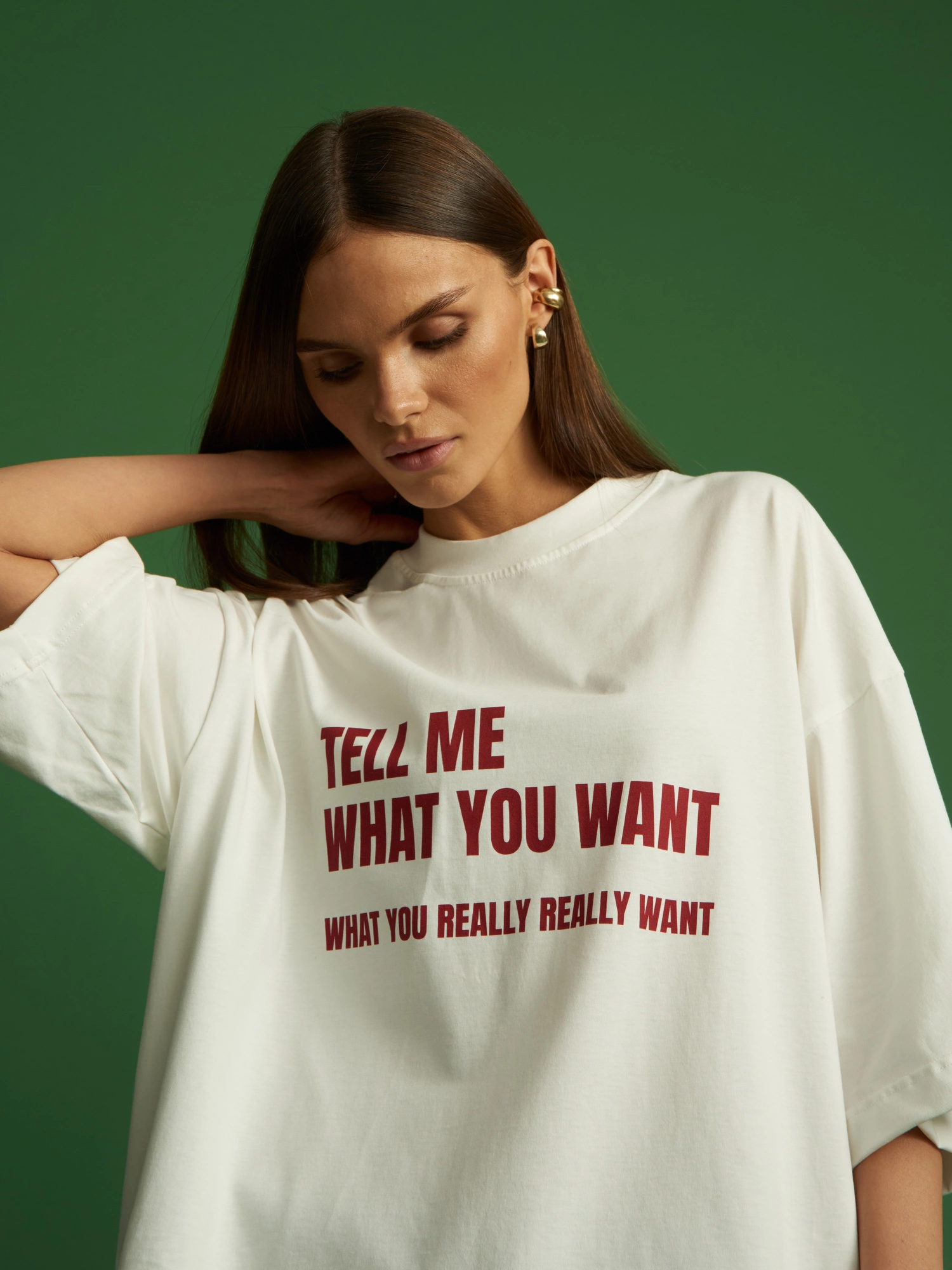 T-shirt oversize wykonany w 100% z miękkiej, wysokogatunkowej bawełny. Luźny krój i wyrazisty nadruk “Tell me what you want, what you really really want” nadają mu swobodny, streetwearowy charakter. Komfortowy, stylowy i z dystansem – noś go tak, jak lubisz: do jeansów, legginsów lub jako przełamanie eleganckiej stylizacji ze spódnicą lub garniturowymi spodniami.