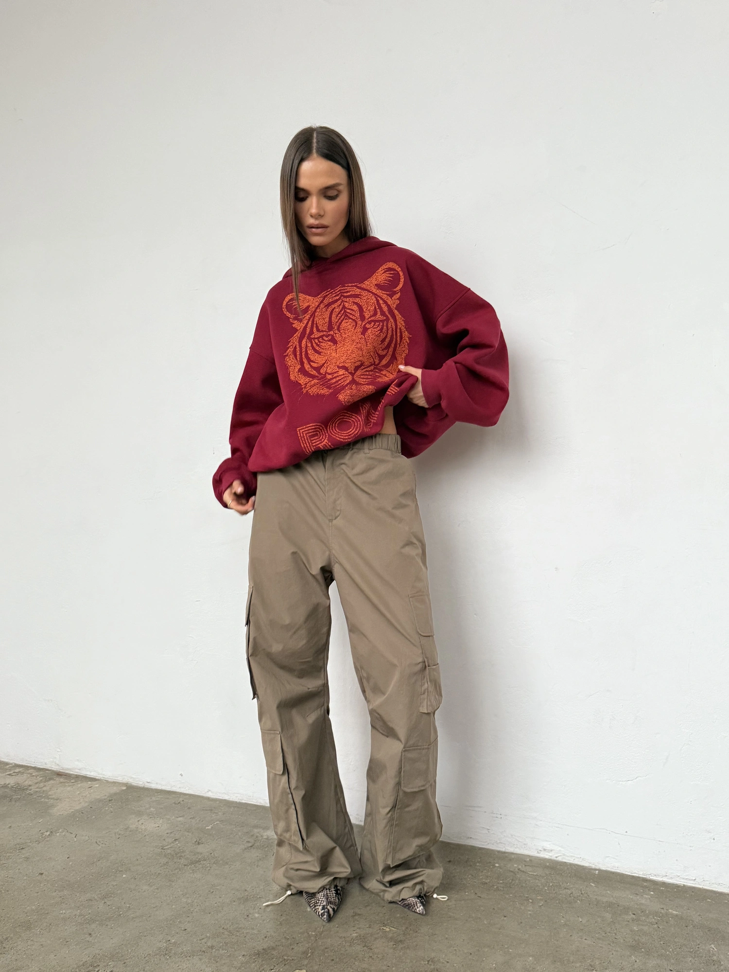 Krótka bluza oversize z dużym kapturem. Wykonana z miękkiej bawełny, wewnątrz wykończona misiem. Jej fason bombki wyróżnia się szerokimi i długimi rękawami z mankietami oraz wąskim ściągaczem w pasie, który nadaje jej oryginalnej, objętościowej formy. Bluza podkręcona jest unikalnym, trwałym nadrukiem, który dodaje jej charakteru. Doskonała w zestawie z JOGGERAMI, legginsami czy jeansami.