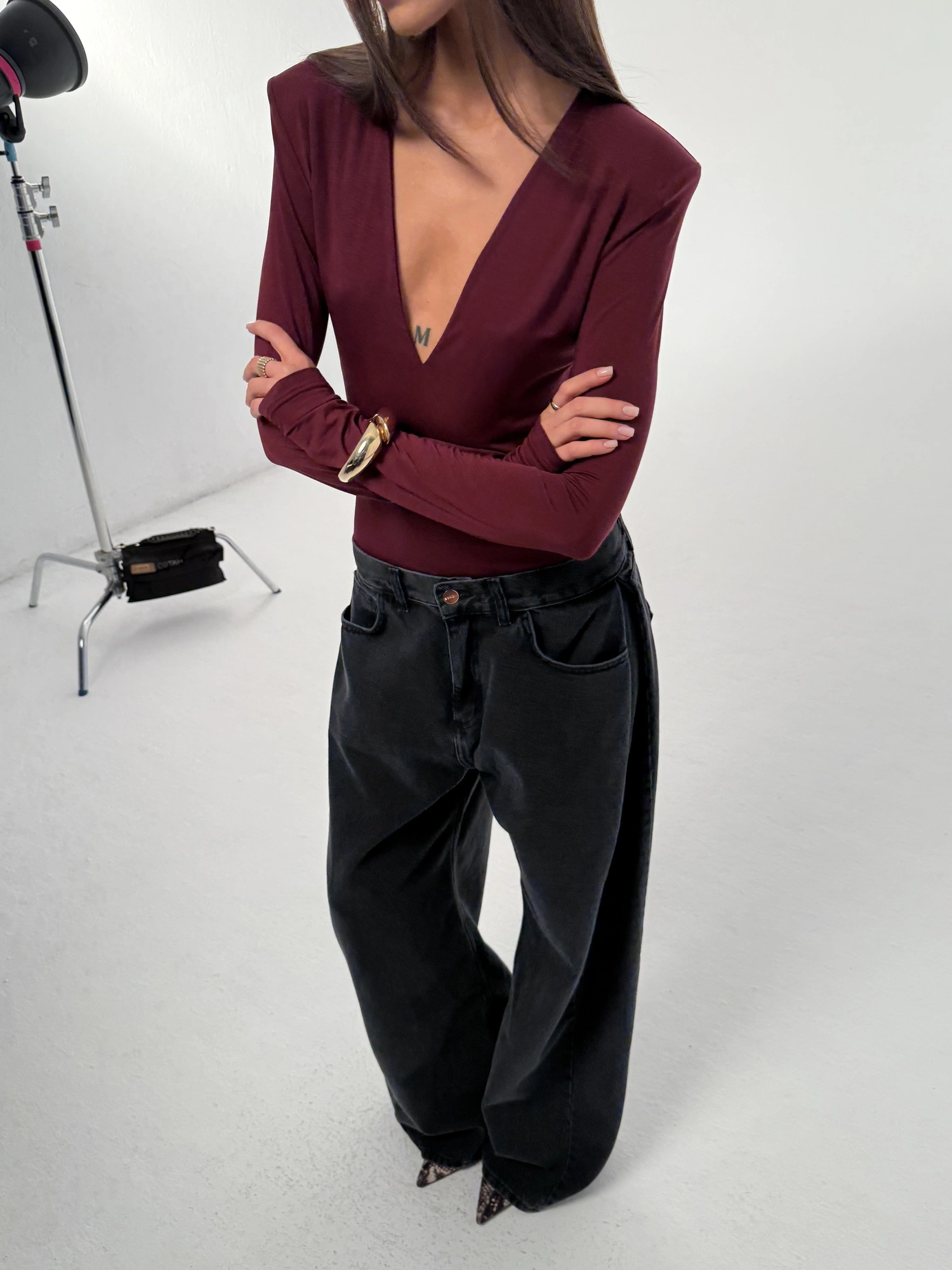 Dopasowane body z długim rękawem i głębokim dekoltem w kształcie litery V. Zmysłowo podkreśla ciało, a poduszki na ramionach nadają całości eleganckiego charakteru. To propozycja, która świetnie prezentuje się w połączeniu ze skórzanymi spodniami, spódnicą czy luźnymi jeansami. Proste, minimalistyczne, ale z charakterem - wystarczy dodać ulubioną biżuterię i dodatki.