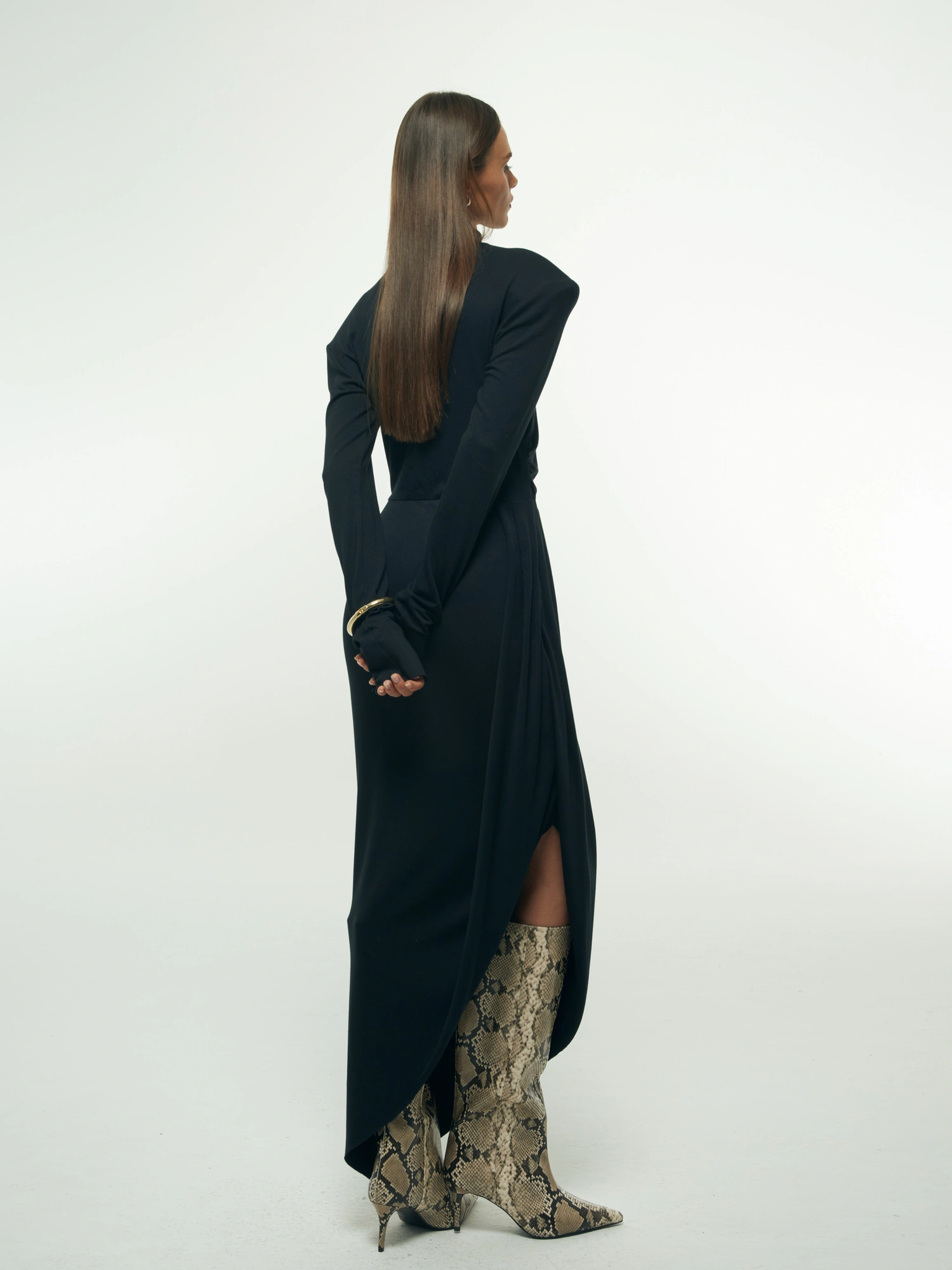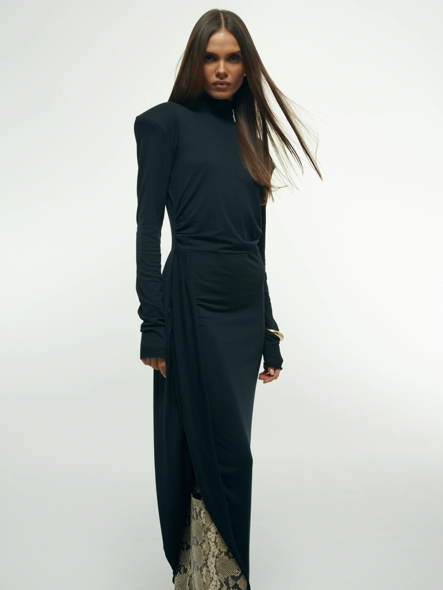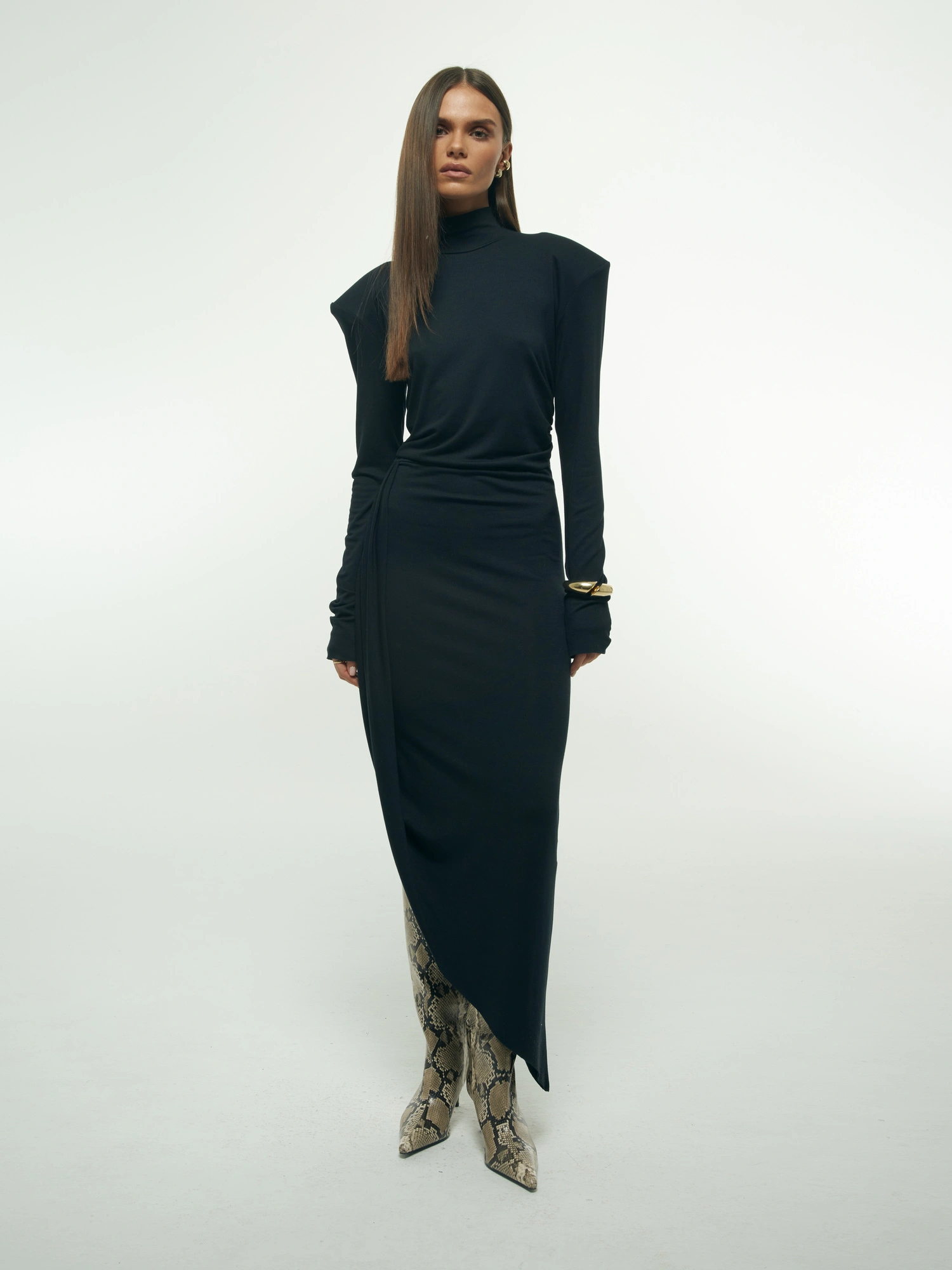 Elegancka sukienka maxi o minimalistycznym, ale wyrazistym charakterze. Ma długi rękaw i stójkę, a całość przełamana jest mocnym akcentem w postaci poduszek na ramionach. Asymetryczny dół ze zmysłowym rozcięciem na nodze nadaje lekkości i podkreśla linię ciała w ruchu, a ozdobne marszczenie w pasie pięknie wysmukla i akcentuje talię. Materiał jest miękki, elastyczny i w dotyku sprawia wrażenie cienkiego sweterka dzięki czemu jest bardzo wygodny i dostosowuje się do sylwetki.